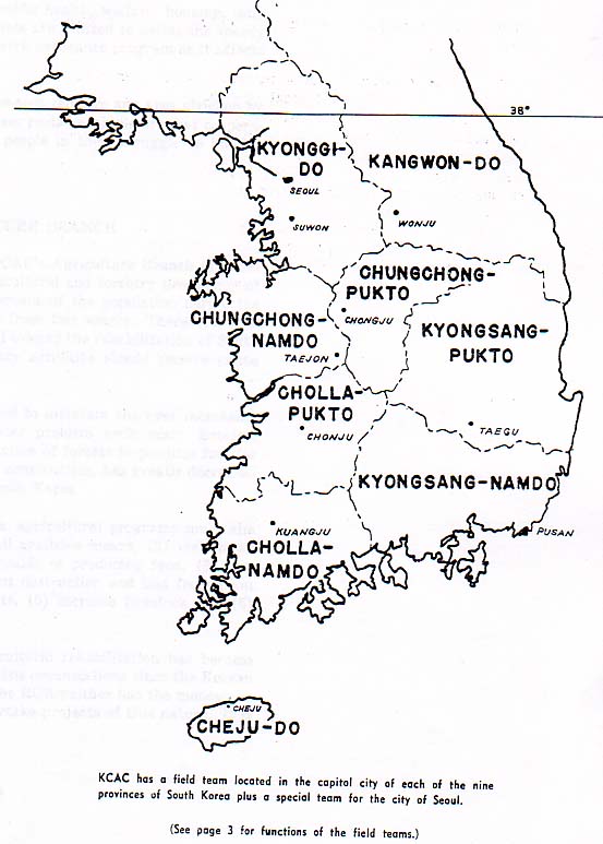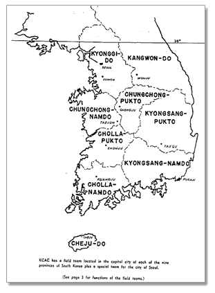 The functions of the field teams of the Korea Civil Assistance Command are best expressed in terms of the functions of KCAC itself; for the teams are the operating and implementing arm of the command and the backbone of the civil assistance program. What KCAC is to the national government of Korea, so too is the field team to the provincial governments, and the success of the entire rehabilitation effort depends in no small measure upon the smooth functioning of the KCAC field teams.