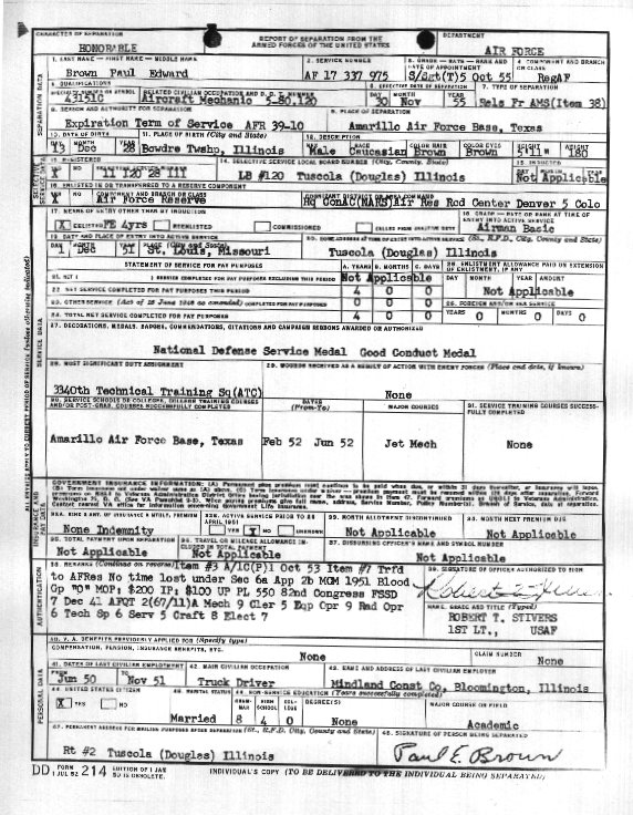 Paul E. BrownCamargo, IL Entered Service, November, 1951 "I volunteered for the Air Force rather than get drafted. The draft was coming up and I thought I would enjoy the Air Force and I wasn’t sorry. It was most interesting." - Paul E. Brown