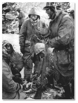 Spending the day hunkered down in the snow, we received sporadic sniper fire. Word filtered down that we had to wait for engineers to build a bridge. About dusk, a sergeant or lieutenant came down the column and spotted our little group. I was ordered to take our fire team and tie in with a rifle company on our right flank. By this time it was dark and starting to snow. We figured if we just kept going uphill, we should run into the Rifle Company. After walking for about thirty minutes and making no contact, I noticed we had veered off the ridge. We seemed to be in a draw or gully. Calling a halt, I told the men I thought we had come far enough. It was dark, we didn't have a password, and I felt we should stop and set up a perimeter till daylight. Everyone thought this was a good idea. We formed a circle with our feet inboard, lying on top of one parachute and pulling the other over us, huddling together to keep from freezing.