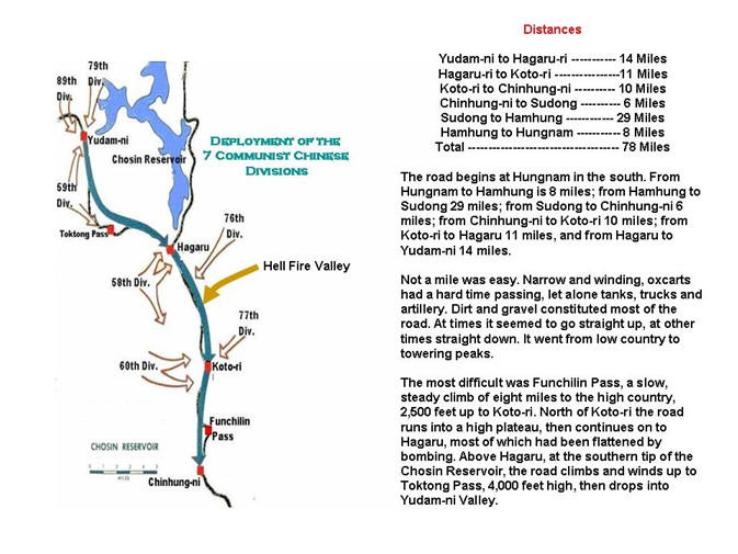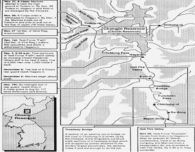 Colonel Puller could only spare one Rifle Company to reinforce the Marines to the north. Clearly this was insufficient, particularly in light of the action being fought by Dog and Fox Companies that same day! The only solution was to form a composite unit with whatever forces that could be pulled together. On November 28, 1950, the British 41st Independent Commando Royal Marines Battalion had also just arrived at Koto-ri to operate under the X Corp. When transportation and equipment had been found, the initial intention was for it to serve as a reconnaissance group. Although the unit was new to Korea and had not seen any action as yet, there was a matter of urgency to reinforce the Hagaru-ri perimeter with every available man. The British unit’s commander, Lieutenant Colonel Douglas B. Drysdale, was ordered to command the composite unit which was named Task Force Drysdale. The mission of Task Force Drysdale was to cut through the Communist Chinese Forces along the 10-14 miles road stretching between Koto-ri and Hagaru-ri. The Task Force numbered around 900 men with armor support. Among others, this included 235 members of the Royal Marines, about 205 US Marines, of Captain Carl Sitter's "G" Company, some 190 soldiers of Captain Peckham's Baker Company, 31st RCT, and about 82 U.S. Marines (clerks, truck drivers, military policemen and several US Navy corpsmen attached to the 1st Marine Division). In all, the Task Force would consist of personnel from 10 different organizations. On November 29, 1950, my Heavy Weapons Platoon, Dog Company, 31st Infantry Regiment, commanded by Lieutenant White our Platoon Leader, and attached to Captain Charles Peckham, Commander of Baker Company, 31st Infantry, was made part of Task Force Drysdale. There was no time to feed the men before we started our journey toward Hagaru-ri. After starting the move north, the Task Force was reinforced with 29 tanks, 76 vehicles and trailers, and 287 Marines from different Marine units. Their arrival increased the size of the Task Force to nearly that of a Battalion. The official Marine Corps history of the operation, accounts for approximately 922 men plus vehicles, trailers, and tanks. However, in spite of its impressive numbers, the heterogeneous make-up of the unit rendered the Task Force ineffective as a fighting organization. This fact soon became evident at Hell’s Fire Valley. Hell Fire Valley"Hell Fire Valley" was the name given by Colonel Drysdale to the scene of the all-night battle between the Chinese and more than half of Task Force Drysdale on November 29, 1950. In the confusion along the road, roughly 400 members of Task Force Drysdale were left stranded and out of radio contact in Hell Fire Valley and completely surrounded by vastly numerically superior Chinese forces. The valley was about one mile long, covered with a frozen crust of snow and offering very little cover. It provided a convenient approach to the rear, with the Communists having the advantage, since they were entrenched on the upper regions of the precipitous slope. The higher ground rose sharply on the right side of the road, a railroad to our right was infested with Chinese soldiers, while on the left a frozen creek wound through a field several hundred yards wide, bordered by the Changjin River, the Communists were dug in, and there was a mountain to cross. About 50 to 100 yards ahead of us was what was left of Colonel Drysdale's 41st British Commandos, getting cut to pieces. They withdrew to our position sometime around 2000 hours (8 p.m.). The whistles, bugles, and battle yells alerted us to be ready for the mass of Chinese Communists forces that spilled out of the night. The screeching blasts of their damn whistles and bugles made our flesh crawl, as the sound reverberated through the chilled night air. After several minutes, the sound of gunfire, bugles and whistles would die down and stop. The map below, Figure 7, illustrates the battle chronology of events that took place in the vicinity of the Chosin Reservoir, including the area of Hell Fire Valley. The Chinese Communists were very clever. They were well trained and had perfect discipline. They enjoyed the comfort of the darkness, and during this time, they would crawl in close and then, with the sounds of the damn whistles and the blaring of bugles, the night was suddenly shattered. The night was in turmoil, broken only by the sounds of bugles, loud blasts of whistles, and then the battle yells at the onslaught of the attack. For what seemed like an eternity, a death-like silence hovered over the bitter cold darkness. We listened and waited. Suddenly the eerie sounds of the bugles and whistles could be heard again, only this time much closer. We gripped our weapons, pointing them into the darkness that cloaked everything. Mortar rounds and grenades slammed into the ground close by, spraying a shower of shrapnel over us. Here we were, the United States and United Nations Forces getting the hell kicked out of us, running out of ammunition, with malfunctioning weapons caused by the extreme cold, and about half of our men either dead or seriously wounded, while wave after wave of Chinese Communist soldiers, screaming and blowing their damn bugles and whistles, descended upon us! The killing was so savage!! The Chinese had to climb over the bodies of their own men to continue their onslaught. In addition to our small arms (rifles, carbine, and pistols) and some hand grenades, we had no weapon larger than one 75mm Recoilless Rifle. What 60 and 80mm mortars we had, were out of ammunition. We were nearly out of ammunition and, because of darkness, had no air support. You've got to understand what it feels like to be in combat with your ammunition nearly gone, or with a weapon that doesn't work! Among other thoughts of anxiety and apprehension, the feeling is ……. total helplessness! We would shoot down a whole wave of them buggers, and another wave would be right behind. They kept