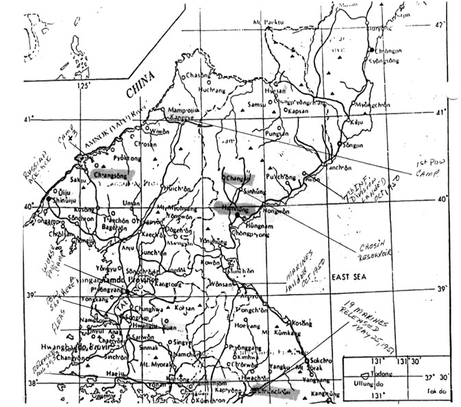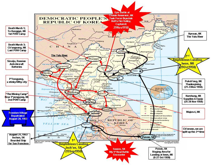 Map of Associated Events Map of My Journey through Korea from Landing to Repatriation The Red lines show my journey as a POW. The Black lines show my journey prior to my capture.