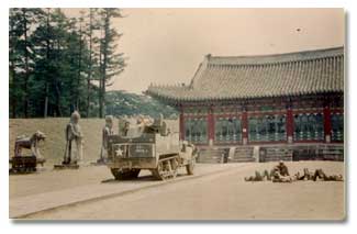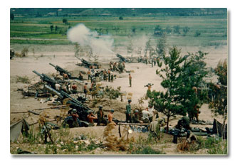 In the morning, we moved northwest back to the Han River and set up shop. I think Division Artillery found out about us because we began shooting for air observers as a general rule from then on. We moved again into a valley and I think we stayed there a week or so. Our little bulldozer built gun pits for us. Lt. Bob Hankins, our executive officer, tried dry cleaning his field jacket with gasoline, and the red lead gave it a definite reddish tinge. We had missions with powder without flash reducer strips. The shells came out with a noisy bang and lots of fire at the muzzle. It was decided not to fire them at night. I’m not sure but that they were World War II powder bags. They had low serial numbers. We had lots of powder from a hundred different powder lots. It was hard to get a lot of only one number to use for registrations. We had one mission with a ground forward observer. He had an attack coming at him, and he got our shells landing on their front lines. They would just about get organized again, and he would call our battery to shoot on them again. Finally, his unit was leaving the hill so he had us set up to hit his hill in fifteen minutes; then the gully behind his hill in ten minutes; and then the hill above the gully in five minutes. As he huffed and puffed, he reported that it worked like clockwork. We were ordered out of our nicely prepared position and were to go back to the Han. It was to be a night occupation of position, using very few lights only when necessary, and being very quiet. We moved into the new position and got ready to lay the battery (get it pointing in the right direction). Hank Hankins gave the command, "Battery adjust, aiming point this instrument." The command was relayed quietly to the guns and the gunners were to look for us in their sights—a flashlight with a cross in the lens over the aiming circle. Just then, a searchlight battery accidentally turned on their lights behind us. We had broad daylight! We were lit up for a split second. Word went out to the searchlight group and within 2-3 minutes the lights went out. The night occupation turned into a daylight occupation. As was their wont, the battalion fire direction control would have us point to the left; B Battery point to the center; and A Battery point to the right, with just a little overlap between batteries. The next morning, the lowly Recon Officer was given a half battery. He took three guns, an ammo truck, a three/quarter ton with radios, and his jeep and went up to the front lines near our old position before the road jam. It was nice. We had our own FDC (Fire Direction Center) and no battalion to bother us. The air observers checked in, and Sergeant Tyford’s gun section got three rounds in the air before the first one landed during the registration—a normal occurrence. Then we shot at whatever the air observers found in the way of targets—a couple of guns and maybe 300 Chicoms [Chinese communists]. The battery sent up supper, and we continued to shoot. Finally, at sundown we quit, and closed station. – Oops, one more juicy target. We opened station again and shot up 45 rounds in six minutes. The lieutenant gave CSMO and tilt; one gun still had a round in the chamber, and couldn’t get the breech closed. The section was busy getting a ramming staff ready to punch the round out from the front end, and the lieutenant and the gunner were busy trying to clean up a week’s worth of burnt carbon on the breechblock threads. We finally got the breech to close. With that, we fired one round at 800 mils (45 degrees) with full charge seven. I shot a shell into the air and it fell to the ground, I know not where (but it was maximum range). We packed up and moved out smartly. We got back into the battery at midnight. At three o’clock, the Recon officer was roused out and sent up to set up an observation post for a bunch of tankers. Called Task Force Plumley, they were located a mile or so in the dark up on a sand spit in the Han River. The Recon officer was lucky and bumped into Captain Plumley’s tank in the dark, hung around his command post all night, and the next day at dusk, he was relieved by another forward observer from another outfit. The lieutenant was back in the battery for a day, which we think was the second of May, and then sent back out to the tankers. An unusual thing had occurred. As the 24th Division had pulled back, and the Third Division on the left had pulled back, the sand spit stuck out like a big sore thumb, unoccupied between them. That’s why the tankers were suddenly pulled out and sent there with the Divisional Reconnaissance Company and a chewed up Ranger Company to plug the gap. Charlie Battery was pointed in their direction, and was the nearest artillery unit, so we provided the forward observer. even though it has been said that corps artillery batteries do not have forward observers--well, hardly ever. It was a scratch operation, and since 24th Division Artillery didn’t want to move a 105 howitzer battery and furnish a forward observer to support Task Force Plumley, they let the unusual set up alone. Our 155 battery supported the tankers. The battery observation post was set up on a riverbank about a quarter of a mile away from the tanker command post and could see everything in front. We laid wire to Captain Plumley’s command post, and then sat back and checked into the battalion. (They laid wire to us—for a change) every half-hour for a while, until they got tired of it. We were there for two weeks. We suddenly had visitors. The brass in Corps Artillery, Division Artilleries, and Divisions just had to come out and see this set up. We saw a lot of stars, usually around eleven o’clock on nice days. If it was raining, forget it. The brass also decided we needed more stuff, so they sent us half the quad fifty half-tracks in the division--twelve, I think. Then the engineers came and built a double apron barbed wire fence in front of us. We fel