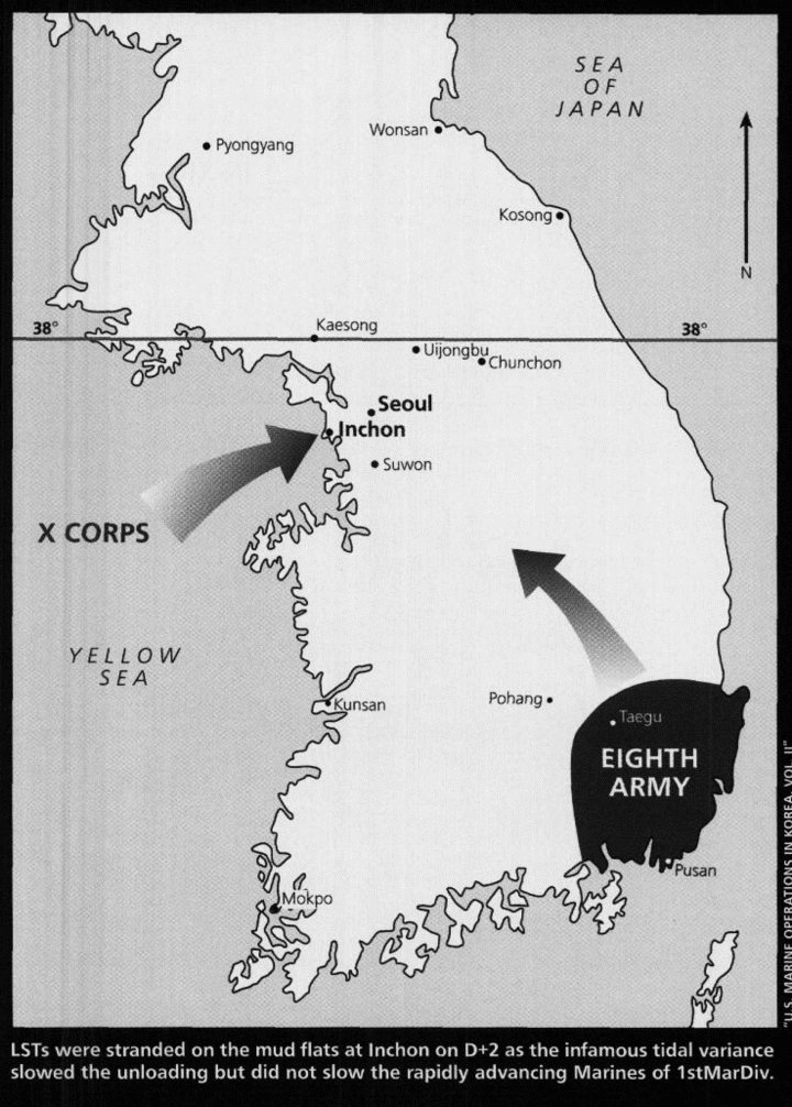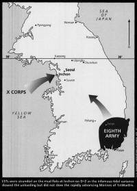 By mid-August of 1950 the American and allied troop situation in Korea was fast becoming critical. Under relentless attack by a North Korean People's Army (NKPA) that was superior in numbers and equipment, friendly forces had been driven to a small perimeter of resistance about the vital port city of Pusan on the southernmost tip of the Korean peninsula. Clinging grimly to this last bit of real estate, the defenders awaited the all-out offensive that was designed to drive them into the sea. The gravity of their position was vividly illustrated by the words of a British military observer who wrote of the very real possibility of "being faced with a withdrawal from Korea" if the coming onslaught was not turned back. It was in this atmosphere of crisis and danger, confronted with the specter of defeat, that one man was thinking in terms of victory. Faced with an enemy who had known nothing but success, with his own forces battered and barely holding their own, General Douglas MacArthur, supreme commander of allied forces in Korea, saw the opportunity for a smashing counterstroke. Victorious though it may have been thus far, the NKPA, in MacArthur's estimation, had just about run out of steam. What the communists had gained had not been won without cost. Their frontline troops had been chewed up, their supplies were being eaten up fast, their vehicles were beginning to stagger and stumble for want of maintenance. If the weary troops holding the Pusan Perimeter could stand their ground just a little bit longer, the North Korean invaders would be ripe for a knockout blow. What MacArthur had in mind was not merely turning back the North Korean forces, but completely destroying them.