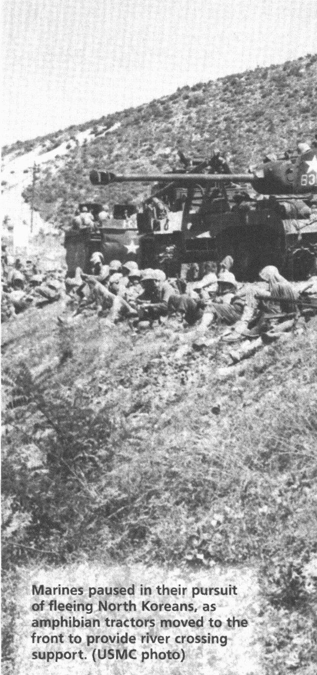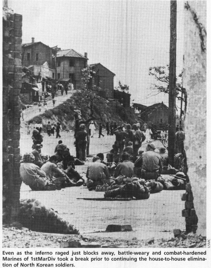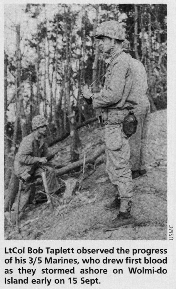 Like other invading armies before them, the North Koreans had driven into the South by way of the natural terrain corridor running through Seoul and on southward in the western region of South Korea. It was along this route that the long NKPA supply line ran. Sever that supply line, and the NKPA forces ringing the Pusan Perimeter would be cut off from their strategic base in the North. The attackers would become the defenders, faced with enemy forces in their front and rear. In MacArthur's judgment, there was only one place to cut the NKPA supply line, one place that would permit the total destruction of the NKPA. That place was the port city of Inchon on South Korea's west coast. An amphibious assault at Inchon and a swift drive inland would seal the fate of the NKPA. There were other possible objective areas, but none offered the potential for putting the NKPA's collective neck in a noose. Inchon was the strategic center of gravity for the entire situation in Korea in midsummer of 1950. Seize Inchon, and in the words of a long-forgotten Confederate soldier in another war, "You git to play th' music while th' other feller has to dance." The catch in the whole thing was that Inchon was a hydrographic nightmare, one fit to bring an amphibious task force commander out of a sound sleep with his heart pounding. The shallow waters off Korea's western shores were a natural barrier to deep draft vessels, affording access to the coast only by narrow, restricted channels. The approach to Inchon was particularly tricky, a twisting passage through a maze of sand bars and mud flats where an incautious skipper all too easily could run aground and block the passage of every ship that followed him. Strong water currents multiplied the chances for mishap. Beyond the harbor approach itself there was Inchon's infamous tidal range, among the highest in the world, where the difference between high tide and low tide could reach almost 35 feet. What might be a usable landing beach at high tide became a mile and more of untrafficable mud flats at low tide. If that weren't enough, the peak high tide necessary to meet the draft requirements for LSTs (tank landing ships), would last only three hours and would occur on only a few days in mid-September. Among these days the best of a bad lot was 15 Sept. Even then tidal conditions would not be good, merely the least bad. Lastly, there was Wolmi-do Island. Connected to the mainland by a causeway, Wolmi-do sat squarely between the boat lanes leading to the only practicable landing beaches. Before the problem of Inchon could be approached, Wolmi-do would have to be neutralized. As a practical matter then, the Inchon operation would have to be conducted in two acts. Wolmi-do would have to be secured before anything else could happen. Then the entire amphibious task force would be forced to sit twiddling its thumbs while it waited for the next high tide 12 hours later. Interesting things could happen in those 12 hours, things admirals and generals don't like to think about. Rear Admiral James H. Doyle, whose Task Force 90 would be faced with the problem of negotiating these daunting obstacles, was an old hand at amphibious operations. A veteran of many such undertakings in the Pacific, RADM Doyle was widely recognized as the Navy's premier amphibious commander. Considering the many complexities of a landing at Inchon, he had only this to say at a meeting with MacArthur on 23 Aug.: "General, I have not been asked nor have I volunteered my opinion about this landing. If I were asked, however, the best I can say is that Inchon is not impossible." If RADM Doyle was confronted by monumental problems getting the task force to the objective area, the commander of the landing force, Major General Oliver P. Smith, had the equally daunting task of putting that landing force together from scratch. MajGen Smith's First Marine Division was scattered to the four winds. One of his regiments, Lieutenant Colonel Ray Murray's 5th Marines, was at that very moment heavily engaged in combat in the perimeter ringing Pusan. The Ist Marines, led by the redoubtable Colonel Lewis B. "Chesty" Fuller, and hastily assembled from Marines plucked from posts and stations throughout the Marine Corps and recalled reservists, had not even reached Japan. Like the 1st Marines, Col Homer Litzenberg's 7th Marines had not even existed except on paper two months earlier. How bare the cupboard was could be seen by the fact that Litzenberg's 3d Battalion had only days before been the 3d Bn, 6th Marines. Afloat in the Mediterranean when fighting broke out in Korea, the battalion had been rushed through the Suez Canal and the Indian Ocean, donning its new identity en route. The 7th Marines would not arrive in the area in time to take part in the landing. MajGen Smith would have to conduct a division-size assault with only two regiments that had never trained together. Nonetheless they would land, and they would land on 15 Sept. At 0520 that morning, after two days of constant pummeling by naval gunfire, the traditional signal, "Land the landing force" was raised to the truck of the mast of RADM Doyle's flagship, USS Mount McKinley (AGC-7). Even as the assault elements of LtCol Robert "Bob" Taplett's 3d Bn, 5th Marines boarded the landing craft that would take them to Wolmi-do, gull-winged Corsairs of Major Arnold Lund's Marine Fighter Squad- ron (VMF) 323 and Maj Bob Keller's VMF-214 continued to paste the island with bombs, rockets and napalm. Firing almost point-blank, the destroyers Southerland (DDR-743), Gurke (DD-783), Henderson (DD-785), Mansfield (DD-728), DeHaven (DD-727) and Swenson (DD729) pumped more than 1,700 5-inch shells into the cave-sheltered NKPA artillery defenses. From farther downstream the cruisers Rochester (CA-124) and Toledo (CA133), along with the British cruisers HMS Kenya and HMS Jamaica, added their 6- and 8-inch projectiles to the hailstorm. Completing the rain of destruction, the thr