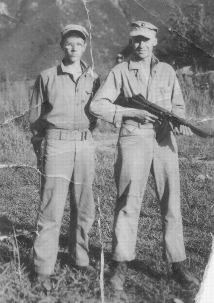 Memoir Contents:Pre-MilitaryMy name is Dale Alfred Erickson of Esko, Minnesota. I was born on January 08, 1931 in Duluth, Minnesota, a son of George Eugene and Winifred Greene Erickson. My father was a grocer and my mother was a homemaker who stayed at home. My father worked for his father in the grocery business called F.W. Erickson Grocery Store, located at 21st Avenue West and 3rd Street in Duluth. My father died when I was eight years old and my mother was left to raise three boys. I was the youngest. My siblings and I grew up in a lower class neighborhood of mostly Swedish and Norwegian people. Mother went to work for department stores Wahl's, Bud's, and Martha Straussberger's Women's Clothing in Duluth. We were on welfare. We were very poor--and we knew it. Hunger was no stranger to me growing up in those difficult times. I was not close to my mother or brothers. I never received any support from them while I was growing up. I was on my own more or less. I lived in a tough neighborhood and sometimes had to fight, but I was never in trouble with the law. Later in life my background in street survival served me well. I attended public schools Ensign Grade School, Lincoln Grade School, East Junior High School, and Central High School. I did not like my teachers, and they did not like me. I was below average in school--an under-achiever, and they could tell I came from a poor family. We did not have much money and I did not get a lunch every day. I played hockey as a youth and was above average in that sport. I got write-ups in the newspaper for that. Playing sports was my way to get out of the house and I made it my social life as well. I loved singing in the school choir. I had a paper route and also worked for a gas station when I was in high school. I did not go into scouting because we could not afford the uniform or money for summer camp. I heard about World War II from my family and I had a cousin that was a member of the National Guard. He served overseas in North Africa and Europe. I knew people from our neighborhood that were killed in World War II and it was sad for everyone. My oldest brother William went into the Navy during World War II, but was given a medical discharge because of asthma. My older brother was Donald L. Erickson. He suffered from a medical condition, so he did not enter the military. I remember the end of the war. All of our neighbors celebrated. I was happy that it was over, but it did not affect me much. Marine Corps ReserveI left school for the military after the 11th grade. I joined the United States Marine Corps in 1948 to get pay for the meetings and to get away for two weeks during the summer. I was underage, so my mother signed the papers allowing me to join the Marine Corps Reserve. She was not hesitant to sign. My feeling was that this was an entity that would allow me to break out of the unpleasant setting that I was in at the time. I think that my mother saw this also. I looked at the Marine Corps not as a prelude to war, but as an opportunity to learn a trade or to further my life's experiences in a structured way--maybe a discipline that I needed at that junction of my life. I also joined the Marine Corps Reserve because I had friends who had joined, maybe for the same reasons. I always thought that the Marine Corps was an outstanding military unit, something that would make me stand out, and would help me make something of myself. The Marine Corps Reserve unit that I joined was called B Company, 4th Infantry Battalion. It was a basic infantry unit--a ground assault force. We had meetings twice a month at the Navy training center in Duluth, where we learned about the Military Code of Justice, Marine Corps protocol, how to wear the uniform, and Marine Corps history (when it was formed and why). We learned military tactics, discipline, leadership, communication, close order drill, marching, survival, and the chain of command. We learned how to use all types of weapons, how to care for them, and how to take them apart and repair them. Although I had fired a .22 caliber a few times, I was not a shooter until I went into the Marines. I received all of my gunfighter training in the Corps. We learned how to live in unfriendly environments, cover and concealment, and how to use explosives. We also learned the important factor that Marines learn to understand--we would do anything to save another Marine. We were taught all of this by officers and senior enlisted men with past military experience. The above pictures were taken while on reserve in Korea in June 1951. Sitting left to right: Corporal Gerold R. Courture, Corporal Gordon J. Nelson, Captain M.T. Matthews, Sergeant Tom A Marron, Sergeant Leroy R. Pearl. Kneeling: P.F.C Ken Gauthier, P.F.C Larry Lane, Corporal Dale A. Erickson, Sergeant Willis H. Kent, P.F.C Ron Behning, P.F.C Ryan Hietala, Corporal Elwood J. Egnebretson, Corporal Charles K. Hendrickson. Standing: Sergeant Don Jasper, Staff Sergeant Gail Gates, P.F.C Jim Kaskela, Corporal James Riorden, Sergeant Edward S. Spencer, Sergeant John P. Brazerol, Sergeant Howerd B. Colford, Sergeant Melvin Hendrickson, Sergeant James A. Thompson, Sergeant Eugene A. Isakson. We went to summer camp for two weeks. One year we were sent to Camp LeJeune, North Carolina, where we learned to make amphibious assault landings. We also learned to shoot at the rifle range using machine guns and other weapons. We did map readings, held night operations, and had recreation. Another year we were sent to Camp Pendleton at Oceanside, California, to learn the same things. I lived at home while I was in the Reserves. I worked at odd jobs and worked at a gas station and in a bakery. I had girlfriends, but no serious relationships. I went fishing with friends. I went to church, but not on a regular basis. I played sports - football and baseball, and attended semi-pro hockey games. I played semi-pro hockey. I attended school dances. I liked big band and jazz music. War