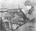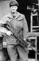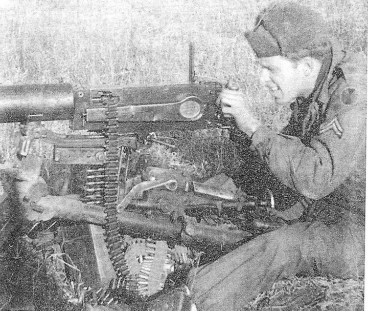 Robert W. "Bob" FarisArizona - "Water cans were stored next to the stoves to keep them from freezing. We were allowed to have beer under our cots. Even with the stoves glowing red 5 feet away, on particularly cold nights the beer would freeze. By morning the inner walls would be covered in frost. In order to keep uniformly warm, it was necessary to keep turning with your sleeping bag all night or one would bake on one side and freeze on the other." - Bob Faris <------ Bob Faris pictured with a Canadian-made Bren light machine gun in 7.92mm caliber. |