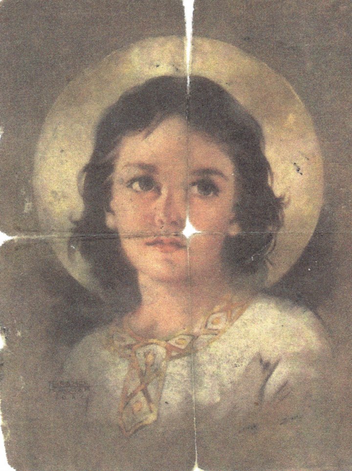 The picture that Richard found and carried in his wallet until his death was called “The Child Jesus (God)” and was originally painted by Florence A. Kroger. Florence was born in 1897 and died in 1980. Florence’s work appeared on the front cover of the 1933 Home Magazine. Her images of Christ appeared in Catholic magazines such as the Cincinnati-based Messenger. Florence became a successful commercial artist who lived in California in the 1950’s. Aside from the religious works of art, she was most remembered for her nursery images in soft pastels. Florence’s art work was quite extensive and she grew up as part of a famous family, the Krogers of Cincinnati, Ohio. The Krogers are known for the line of grocery stores they started which operate today in many parts of the country.