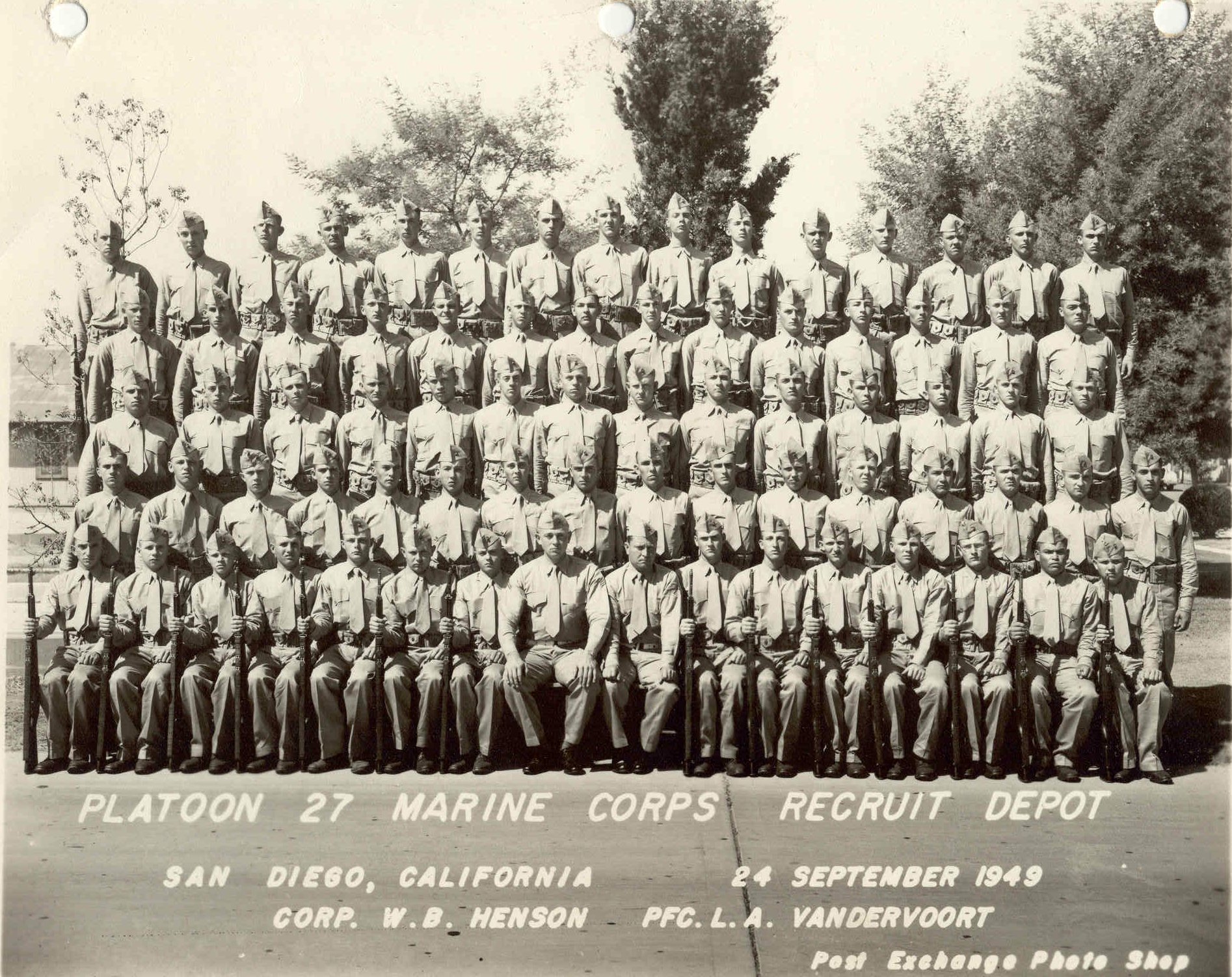 The training camp area at San Diego, California, was flat, sandy, hot during the day and cool at night. When we arrived there, we were assigned to Casual Barracks. Jerry was "chewed out" for bringing acne cream. We were also advised by the drill instructor that, "We were the grass and he was the mower who was going to trim us all into shape." We got our haircuts...short! Our barracks for the remainder of boot camp were two-story, California stucco with red clay tile roofs. There were doors on either end of the building. These barracks are the same ones that are still in use at San Diego today. "Lights out" was 9 p.m. Just before that, we had some free time to read, write a letter, wash clothes, or shine our shoes. The only time we were awakened in the middle of the night was to stand Barracks Guard duty. Boot camp was 12 weeks of learning basic rifleman skills, watching films on health and military equipment, personal fitness, hygiene, map-reading, and drill, drill, drill. We went everywhere as a group. We marched. We lined up for everything from chow to church. We were awakened by lights being turned on at 4:30 a.m. and the DI commanding, "Hit the deck!" Cpl. W.B. "Swede" Henson and Pfc. L.A. Vandervoort, both World War II veterans, were our drill instructors. I thought Henson was very strict. Vandervoort was less so. Henson had the whole platoon drilling again and again for one recruit's error, while Vandervoort "double-timed" us more frequently. There were no black recruits, but several Mexicans were in our platoon. We were a mixture of mostly Texans and Iowans, plus some from other states. The only prejudice I noted was our top DI could not pronounce the name of a Texas-Mexican recruit. Since the name before his was Johnson, the recruit was told to answer at roll call to "Johnson Jr." We were required to take several kinds of tests. We took IQ tests that were supposed to place us in suitable jobs in the Marine Corps. Recruit Johnny Lawyer scored highest and accepted OCS training. I was next highest in score, but was not offered OCS. Nor would I have taken it, since it required signing up for two more years of duty AFTER the Officers School. We also had to qualify on the rifle. We went for a week of rifle training at Camp Pendleton. It was a welcome break from the other training. Held outdoors all day, it was something that I, as a youngster who had been an avid beginning hunter in Iowa and South Dakota, could do well. At the end of the week, we fired at several distances and at different targets. Five or six of us fired Expert and were allowed to return to our tents early the last day and stand "barracks guard" while the rest of the Platoon continued test firing. I was fortunately never in trouble during boot camp. My Boy Scout drilling, as well as the shooting skills acquired from hunting pheasants and rabbits aided me to do things the right way without any disciplining by the DIs. I remember another recruit being punished for wrongdoing. One wiseacre would not accept orders from the "Right Guide" (Recruit Platoon Leader) selected by the DIs. Henson made the two put on boxing gloves and fight it out one night. They fought to exhaustion with no victor. A few weeks later, the Right Guide was replaced. I was Right Guide during the last week, and the wise guy gave me no problems. I recall that there was one recruit who didn't shower frequently enough. A group of fellow recruits scrubbed him down with fiber scrub brushes and Lava soap. He became a regular shower person. During those 12 weeks of training, there were times when I was sorry I had joined the Marine Corps. As I mentioned, it was my first time of extended absence away from my family and high school sweetheart. Also, there were days I despaired whether I could measure up to Marine standards. We drilled in the heat of July, August, and September. At times, I thought the "Marine way" was too rigid, but later knew there was a reason that trained, automatic response was necessary. There were times when the entire platoon was disciplined for the wrongdoing of one individual. When one recruit fouled up the marching drill, we did it again and again. Individual discipline occurred, and mainly was for noise or failing to keep gear clean or orderly. I remember some recruits "double-timing" across the Parade Field in the early evening, carrying two fire buckets (every barracks had these in quadruplicate). They were 3/4 full of fine sand. In my opinion, this collective-type discipline was to teach us to operate as a unit, a team, with every part doing its best job. I did not see any corporal punishment while I was in boot camp, but I heard of one platoon member who had a rifle so dirty that the DI slammed it back into his arms and chest hard enough to bruise his sternum and his stay in "Sick Bay" set the recruit back a week. He graduated with another platoon. Meals were served in the MCRD mess hall. They were filling (I discovered apple butter and orange marmalade, both new to me). And, yes, we had the famous hamburger-in-gravy labeled "S.O.S." and lots of scrambled egg breakfasts. We had lots of chicken, ham, pork, potatoes, vegetables, bread, plenty of fruit, and once in a while, ice cream. Each recruit drew a week's mess hall duty. We had some free time on Sunday, and letters home were encouraged. Church attendance was encouraged, and most recruits went. Marching discipline was maintained, but Sunday was a good day in my memory. The Drill Instructors went a bit lighter on us on Sunday. Also on that day, we participated in Sunday "Smokers" of boxing and wrestling. We got to go see a football game between two Marine teams at Balboa Stadium near the end of the recruit training, but we were under the stern eye of the DI. On the final Saturday of boot camp, there was a Field Day of competitive sports on the Parade Ground. There was boxing, wrestling, and basketball, and our impromptu basketball team took first. We didn't have any drop-outs, 