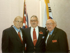 next "USS Repose" homebound hospital list. Going HomeI went by truck to a medical unit, and then went by truck to Pusan. From Pusan I boarded an airplane to Itami airport in Japan. I took a truck or military bus to Yokosuka Hospital. The doctor who was treating my hand at Yokosuka told me to "pack up and stand by" for a return trip to the States aboard the hospital ship "Repose." A military bus took me to catch the hospital ship. At Yokosuka, I was given a half-issue of clothing to replace that which burned in the "E" Med Unit fire. My stored sea bag was located and returned a few days before I boarded the ship and I climbed the boarding ladder with it, along with the rest of a hospital contingent. The Repose transported injured Marines being sent to U.S. hospitals, plus some rotatees going home for discharge or reassignment. The sailing time to the U.S. was approximately 15 days. During that time, I came down with a case of "crabs." It is believed they came from Navy life jackets that everyone was using as pillows and seats on the deck. I was tired. Then relaxed. Then bored. And I was glad to be heading for the United States. I watched a couple of very old movies, and played card games. We hailed another ship halfway home and traded by breeches buoy two movie films and some mail, but their films were even older! The ship's store had some paperbacks for sale, plus you could buy ice cream and cokes at five cents each. The ship's store was open for four hours each weekday. The weather was okay with the exception of a couple of rough days. Only a handful of Marines got seasick. The ship stopped at Hawaii, but I stayed aboard as I'd bought a bamboo fly rod for myself and some family gifts in Japan while at the hospital, and was nearly broke until the next payday. We landed in the States on 15 February 1952, one year from the day I had first shipped out to Korea. By luck of the draw for hammocks, I had slept in a different area of the ship than the rest of the hospital group. Once, I thought I heard my name called on the ship's speaker system, but wasn't sure, so I didn't check. (It could have been KP duty of some kind!) Whoever was in charge of the "walking wounded" didn't look very hard or repeat the call, so I never got an order to stay aboard ship when it stopped at San Diego. The injured Marines and I were supposed to go on to San Francisco, but I didn't know that. When I left the ship, the United States of America looked good, smelled good, and felt good. Everyone aboard sucked in some clean, healthy U.S. air. I stood in line on the deck and was issued my sea bag from the ship's hold. I shouldered the bag and walked down the gangplank to board the military buses. I looked around for my hospital group, but did not see them again -- ever! They had stayed aboard the ship to continue on to San Francisco and the Navy Hospital there. I had debarked at the wrong place! I was taken to the MCRD at San Diego. At MCRD, long lines formed on the Parade Field, facing about eight big signs having letters of the alphabet on them. Since I saw no Marines wearing casts, slings, or bandages, I knew something was wrong. I approached a Warrant Officer, saluted him, and said, "Sir, request permission to speak to the officer." Given that, I said, "Sir, I don't think I should be here." The Old Corps salt advised me, "Son, if you weren't supposed to be here, you wouldn't be here, so form up in your line." I did. The WO and I, and one Sergeant who had a clipboard and stood at the J-K-L sign, were the last three Marines on that Parade Field. The Warrant Officer asked my name and I gave it again. He then asked the Sergeant if I was on his list. Told "No" by the Sergeant, without changing his expression the WO looked me straight in the eyes and said, "Son, I don't believe you're supposed to be here." He then ordered the Sergeant, "Determine where this Marine belongs. Find something for him to do while you're looking." So, for the next five days I became a runner who delivered separation papers and other orders to batches of Marines who were enjoying Liberty Call and making plans to head home. Me? Remember that I was broke and had no records to show when I was last paid and to which place I was supposed to have been shipped. I had NO off base liberty until they located my hospital records at the San Francisco Navy Hospital. Then I could draw pay and on 29 February 1952 start a 30-day leave of absence, going home to Iowa. It was an unusually early spring, mid-afternoon, and I sat under a warm sun on the rear railing of the caboose as we rolled through the Missouri Valley, heading toward Sioux City. I sucked in the lush air, the green, growing smells of the field, and knew that I was truly "home." I'd told no one when I was coming, arrived in late afternoon at the train station and shouldered my sea bag to savor the walk home--about 1 1/4 miles through familiar small-town streets. My mother had barely begun preparing supper when I walked in and asked, "Do you feed hungry strangers here?" She did. Post-Military LifeAfter leave, I returned to my previous duty station of Hawthorne, Nevada, for discharge. That took place on April 4, 1952. I did not consider re-enlisting. I had begun at the State University of Iowa, and was determined to continue. I joke that I never received the rehabilitation course or lecture, but I went back into civilian life quickly and easily. I point out that this might have been because I was in service for a year before the Korean War, out for four months, called back for another 18 months, then discharged again. It was easier for me to adjust than, say, someone who was drafted and went from Boot Camp to battle. I operated a truck-mounted trench hoe and drove a pit gravel truck for a few months after my discharge, and then I resumed my studies at State University. After three years, my G.I. benefits were nearly exhausted. I had only 19 days of school time left. Having married on September 5, 1954 