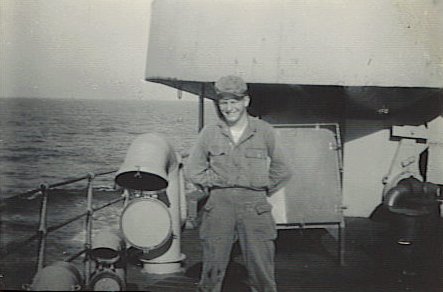 We hit some rough weather on the trip, and I saw a new sight on the chow line that I had never seen before. Several of the guys serving were seasick, but still working and serving the best they could. The guy spooning out the mashed potatoes had his serving spoon in his right hand and was holding the handle of a bucket in his left hand. He spooned out as many servings as he could, then held the line up while he turned around and threw up into the bucket. Another guy was serving pieces of cake. They were baked on large pans called "100-man serving pans or trays." He had set up a new pan and gave out only a dozen or so servings, when he suddenly threw up all over the top of the whole pan. He just picked it up and set it aside, grabbed another pan, and continued serving. The really funny thing about this was that, even with the motion of the ship and guys queasy to begin with, I didn't notice anyone else being set off throwing up themselves because of this. No one was bothered enough that they got out of the line because of the sickness of these guys. We had all been through an awful lot and had learned to live with things that we had never thought we ever could. Also on this trip, we were still existing on the issue of only a couple of sets of clothing and the great number of guys, so that a lot of us passed up on bathing for days at a time. We were already used to going without baths for a long time in Korea.
