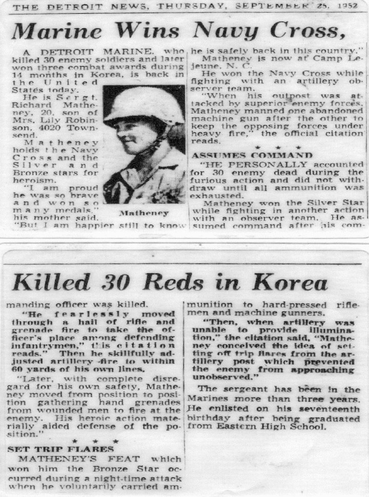 Memoir Contents:Pre-MilitaryMy name is Richard Matheney. I was born December 21, 1931, in Detroit, Michigan, a son of Orville and Lilly McCann Matheney. My father was the president of Local 51 A.F. of L, and my mother was a housewife. I have two brothers: Harry, who is older and Robert, who is younger. I attended Owens Grade School from Kindergarten through sixth grade, Barbour school from 6th grade to 9th grade, Eastern High School tenth grade to eleven and a half. All of these schools were in Detroit. I graduated in 1950 from M.C.I. While I was in school I worked as an usher at the Maxine Movie Theater in the Spring and Fall. I was a dishwasher (Pearl Diver) at Father's Restaurant during the summer. I was a Boy Scout and after my 12th birthday I became a Tenderfoot in the Flaming Arrow Patrol, Boy Scout Troop 363. I learned to live and camp out of doors and I learned about girls. Four other Scouts and I set a record in becoming Second Class Scouts--about two years, but we had fun. During World War II my brother Harry was in the Army. He was a Sergeant and was awarded the Silver Star. Our school sold savings stamps for war bonds, both 10 and 25 cent stamps. I bought both kinds. In 1949 I had a go-nowhere job and was not getting along at home. Mother and Father played the divorce game. My older brother went with the Old Man. My younger brother went with Mother. Not wanting to go one way or the other, I went on my own for a short time. The police brought me home to Mother--they called me a run-away. To enlist at 17 years of age I needed a parent to sign for me and Mother said she would do it. As I went from office to another--Army, Navy, Air Force--to decide which branch of service to join, they all looked the same. Then BINGO, the Marine that I talked with looked great. His green uniform was neat and pressed, his hair was short, and his shoes were shined. I wanted to look just like that. I talked with my older brother, who said I was too small to get into the Marine Corps. He was wrong. After being tested I was on a train headed for Parris Island, South Carolina at 6:01 that night. That was 9 February 1949. Both my mother and father wished me well. Father said not to worry about war because the Big One was over. He also said for me not to try to outdo Harry's Silver Star and to just do what I should to get along. Boot CampNo one that I knew traveled with me on the train to Parris Island. The train stopped at Yemassee, South Carolina, made a turn around and backed into Parris Island. This was a bad sign. When the train stopped we were welcomed by a mountain of a man who was not only big, but ugly, too. He talked nice when he pointed to a flag with a bulldog on it and told us we were "lower than that fucken dog", and to get on all fours and crawl to a 6x6. What's a 6x6? A truck. Then things got better. We were given a haircut, a bucket, scrub brush, soap, two pairs of boon-docker shoes, and all of our new clothes and uniforms. Then we met God. God wasn't in Heaven, but here on Parris Island. God and his helper were S/Sgt. H.A. Ziener and Cpl. J.P. McCartney. Platoon 20 was such a great bunch that in March we got Sgt. J.L. Gilbreath. S/Sgt. Ziener, a World War II vet, was our senior drill instructor (DI). Sgt. Gilbreath, also a World War II vet, was our junior DI, and Cpl. McCartney was also a junior DI. There were no black recruits. Boot camp lasted twelve weeks. During that time we learned how to march, to dig our heels into the deck, first aid, hygiene, compass, history of the Corps, arm and hand signals, weapons of all types, gas mask, Rank's Who and What. The films we saw in the classroom were very educational. The VS.. films I saw still stick in my mind. They showed a baby with V.D. I can still see that poor thing. We also saw combat films. I don't remember much about them--in Korea I got to see the real thing. We learned how to handle a rifle and bayonet and how to take our weapon apart and put it together again in the dark. Most everything was hands-on training. Then we moved outdoors to put our classroom work to use. We learned how to wash our gear--our clothes, socks, underwear, tee shirts, and dungarees. The only proficiency test was platoon related--Platoon 20 against the other bunch of people. We also had a proficiency test at the rifle range for a record score in shooting at a target, which went on our record. Our day started at 5 a.m. with Corporal McCartney banging hell out of our 30-gallon G.I. can. "Hit the deck." Half the platoon made the bed first and the other half went first to the head, washed and shaved. Then the first half went to the head, washed and shaved, etc. We were marched to mess hall and chow call was at 6:15 a.m. We ate very well. I can't remember what food we had, but I did put on weight. We then cleaned the squad bay, dusting, sweeping and swabbing the deck. At 8 a.m. our training started and lasted until 11:30 a.m. We then had lunch at 1:00 p.m. and went back to training of some sort. At 4:30 p.m. we washed up for dinner, which was at 5:00 p.m. At 6:00 p.m., if we had done good during the day, we got a reward. We got to have a field day. We piled sand at one end of the deck with water and scrubbed the deck. We washed windows, lockers, and just about everything. We then had to stand ready for God and his white glove. If he found dirt, we did it again. At 9:00 p.m. half the platoon showered while the other half cleaned our weapon. At 9:25 p.m. we changed sides. At 9:55 p.m. we were told to read and write letters until lights out and then Corporal McCartney said "Lights Out." This was a daily routine. We could go to church if we wanted, but I don't remember anyone going. We were told in a very nice way that God could have our soul, but our ass belonged to the Corps. Parris Island itself is a dismal swamp and in the middle of this swamp is where the boot training is done. There were insects. (The sand fleas were the size of humming birds.) These fleas waite
