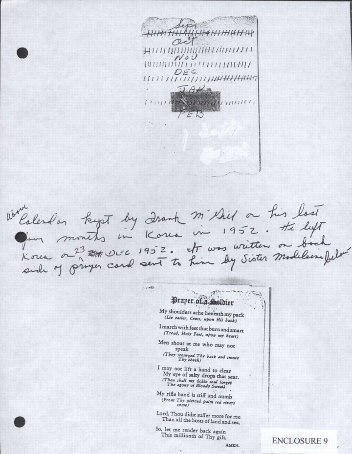 - Copy, prayer card entitled, "Prayer of a Soldier" and handmade calendar