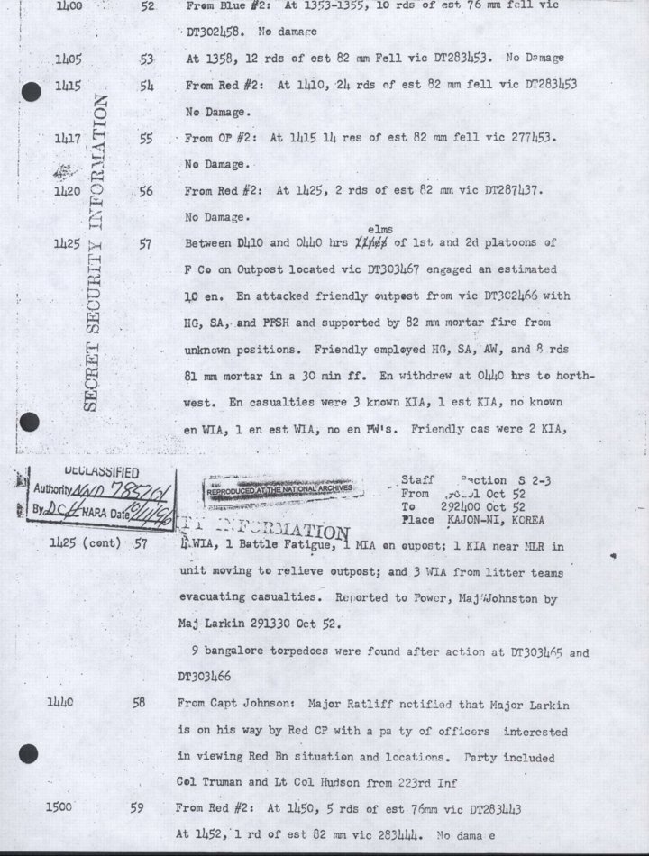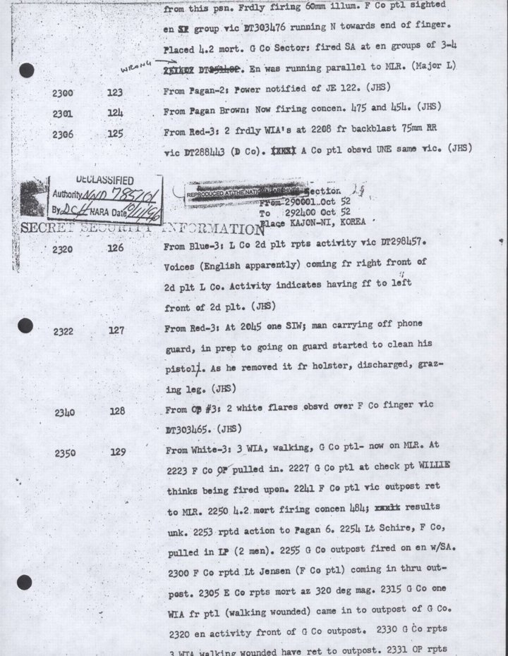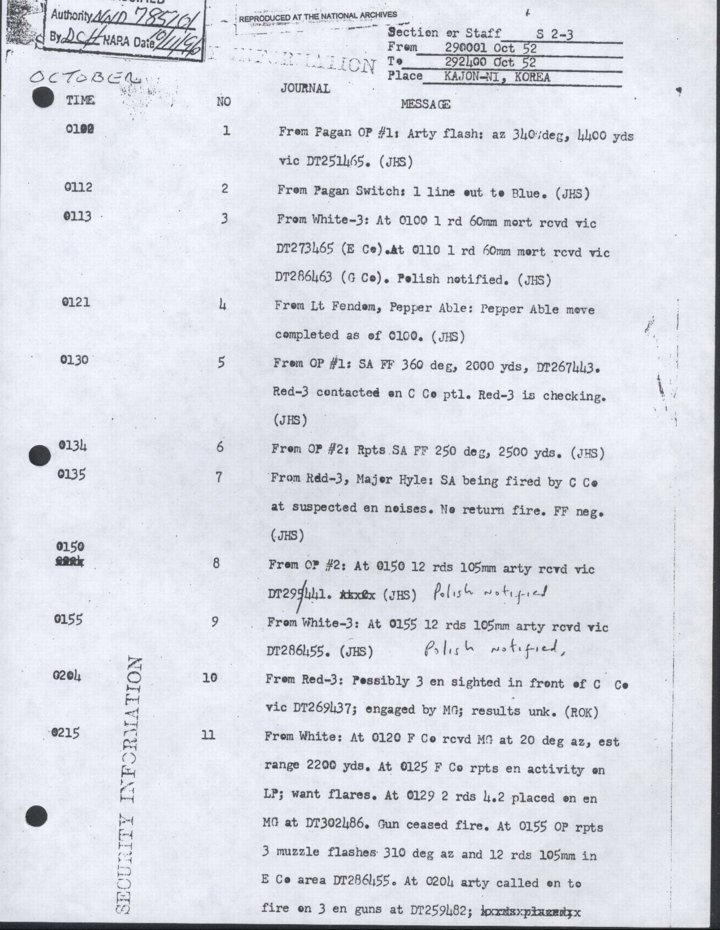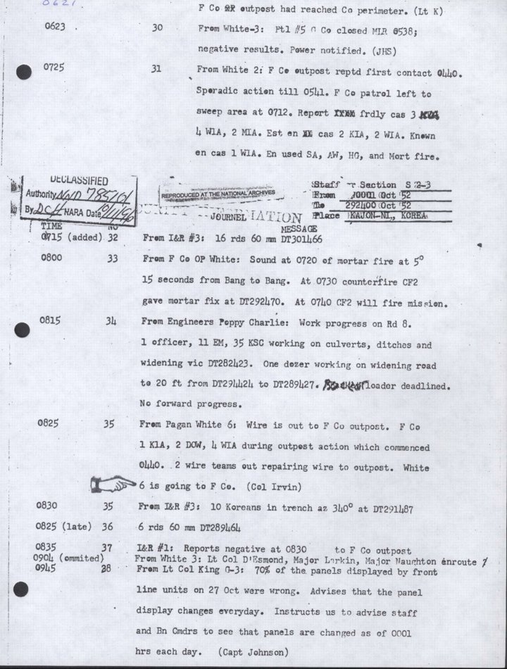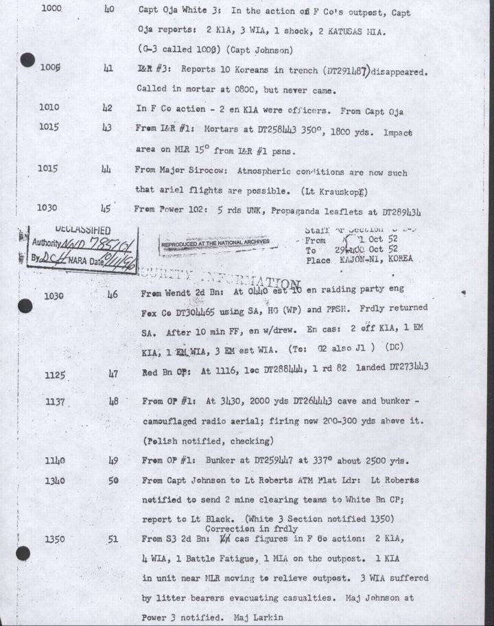 - Copy, Daily Journal for 29 Oct 1952, Monthly Command Report, 179th Infantry Regiment, APO 86