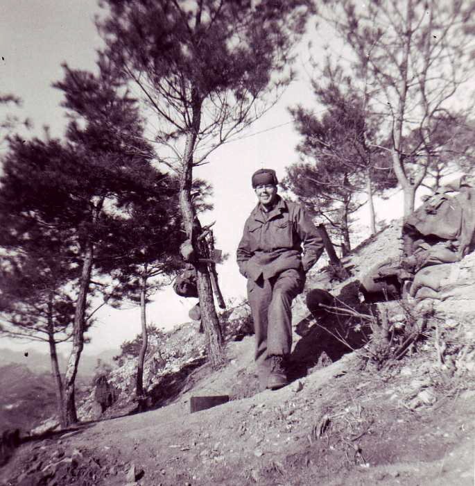 When I got there, I finally got to see what the "front line" was and looked like. I had no idea what to expect because a person’s mind cannot show him what it doesn’t know. Nothing was happening at that time. Things were generally pretty quiet, even quieter when Operation Clam-up came into effect February 10 to 15, 1952. Our artillery was constantly firing at the enemy as "harassment" tactic. This went on all of the time. Right after Operation Clam-up ended, the artillery support was very strong. It was a way of letting the enemy know that we were still there. One thing I did not expect was that when the artillery shells were armed with "proximity fuses", they would sometimes explode when they came in contact with heavy moisture. Sometimes this happened right overhead, and all of a sudden shrapnel was raining down on top of us. Now that was scary. Still, I guess I was holding up as well as any other soldier. As far as fear or being scared, the first night that I was on guard duty was pretty scary because I really wasn’t sure what to expect. These scary times would come and go throughout my stay on the front line—which covered the whole time I was in Korea. I was only in Reserve moving between Kumsong and Kumhwa. I believe that it was two weeks. We were there to rest up. We were living primarily in bunkers and foxholes as, up to this point in time, the positions were fixed and we didn’t need to move them. The bunkers resembled small caves, and were furnished only with our sleeping bags. Like a cave, they were both wet and dry. The foxhole was for our machine gun. We were only in it for guard duty. It was probably about a couple of weeks before we engaged the enemy, and about that long before I saw my first dead enemy. They were two dead North Koreans, frozen solid. I did not see any dead Americans, although I was made aware of two people I knew who were killed while they were in Korea. One was named Ken, but I can’t remember his last name. He was standing the final guard shift of the night at a machine gun position. Just as he was beginning to leave, he was shot in the head by an enemy sniper. The other one was a 2nd Lieutenant from West Point. I can’t remember his name. He was in the company rear when artillery shells started coming in. He didn’t make it to cover in time. As I did not see these men killed, the impact was not as bad as it could have been. Ken had a brother on the front line, but I did not have a chance to talk to him at that time. After I rotated home, I came across the brother, but he did not have much to say. The person in charge of the group I was in was a 2nd Lieutenant. He was an ROTC officer when he graduated from college. The one thing that stood out with the 2nd Lieutenant was his interest in our personal hygiene. He made sure we washed our face, neck, hands, etc. every day, even though it was very cold. It was amazing the difference it made to our morale. Talk about being scared—the 2nd Lieutenant would not sleep at night. He only slept during the day because he was afraid of being killed in his bunker at night. The enemy was good at doing this. Fighting in our area happened primarily during the nighttime patrols. Being in the machine gun platoon, I was not included in the patrols. The machine gun platoon’s job was to give the infantry added support as needed. We were the heavy weapons part of the lighter weapons the infantry carried. We, as well as the .75mm recoilless rifle platoon, were the upfront line support, while the .81mm mortars stayed back at the company rear. These weapons constituted the Heavy Weapons Company. This was the standard distribution for a battalion. I carried my M1 Garand rifle for added protection. I was made even more secure by the fact that there was plenty of support from the rear units that provided the help that was needed in the positions that I was assigned. The 40th Division replaced the 24th Division unit. This left only a few veterans who were replacements to the 24th Division. They didn’t have much experience as they had only been on the front line for a short time. The 24th Division left the front line and went to the rear. The replacements stayed attached to the 40th Division until they had their time in. We stayed in the same place except when we changed positions. It seems as though both sides agreed to settle in on the 38th parallel. In training we had tried to cover every aspect of war plus anything we could encounter in actual combat. We were trained to be combat ready as much as possible so that we could be dropped into battle at a moment’s notice. The one thing we couldn’t train for was the enemy’s real bullets, real mortar shells, and real artillery shells. My "baptism of fire" was incoming barrages of mortar and artillery shells. This took place several times during my stay in Korea. I was never injured by rifle bullets or artillery shells, but several times when the shells exploded, they covered me with dirt, knocked my helmet and other pieces of equipment off of me, and twice that I can recall "duds" landed very close to me. (The duds were even more scary.) The weather was very cold when I arrived in January. It was –30 degrees to –40 degrees. It was difficult to deal with. We had lots of winter gear. At the bottom half, we started with underwear, then long Johns—upper and lower, our wool dress shirt and pants. Next were what we called our "iron" pants. I’m not sure what the material was, but they were waterproof. On top over our wool shirt, we had a pile jacket. Next was a field jacket. We also had a parka when needed. We had a pile hat and two pairs of gloves—a wool pair and a leather pair that went over the wool gloves. The only thing that got really cold were my hands and feet. Though we did have enough clothes, they were not necessarily the best, nor were they necessarily new. For example, I wore a size 12 boot, but the largest that I could get from supply was a size 11 