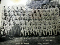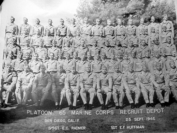 In the first moments at boot camp, we were braced at attention and hazed by a tiny (about 110 pounds) Corporal named Judy. It happened so suddenly, I think we were all shocked by the language and this little guy slapping the crap out of anybody stupid enough to question anything he said. During the first day, they more or less got our attention. We were issued dungarees and a few toilet articles. The recruit depot grounds and buildings were beautiful. There were Spanish tile roofs on the barracks. But we hardly had time to notice that when they were running our tails off. Staff Sergeant Elmer Radmer was the senior DI. His assistant was Corporal Huffman. There were more, but none stayed with us the full ten weeks except Radmer and Huffman. Sergeant Radmer often loudly and harshly stated that we had better give our souls to God because our asses belonged to him. I honestly believed he could have murdered one of us and gotten away Scot free. He worked us hard, drilled us into the ground, and had our complete attention for ten whole weeks. After 51 years, I still remember the names of these two DIs. I have nothing but the utmost respect for what they did for me. During those ten weeks, we learned a lot. Every day there were hours of close order drill and hours of classroom activity covering subjects from personal hygiene to map reading to history of the Marine Corps and on and on. We arose at 0400 and fell into a formation outside the barracks at about 0415. There was an inspection by the DI with much chewing out and sending deficient personnel double-timing around the formation singing out, "I'm a Shit Bird" over and over. Breakfast was at about 0500 and then it was back on the tarmac drilling by 0530. We drilled until 0900. From 0900 to 1145 we went to classes. Some training was in classrooms (there were a number of documentary films but it's been so long I don't remember much about them). Most of our training was in the field. Noon chow was 1145 to 1215. Then there were more classes from 1300 to about 1700, when evening chow went. The food was mediocre for taste, but more than adequate for nourishment. From 1800 to 2200 there was more drill. Lights out was at 2200. We were allowed to go to church if we wished. Some went just to get away from the harshness of the routine, I suppose, but I think a lot went for spiritual reasons. The DIs didn't bother us in church. There was no time to have "fun" during boot camp. There was no free time at all, other than if we went to church. We were in a group from the day we entered boot until the day we graduated. There were no liberties like the Navy boots or passes as the Army called them. There was corporal punishment every day. There isn't room here to write all of the incidents that I could tell. One incident might tell the story. It was about the sixth week. We were in front of the barracks for rifle inspection at 4 a.m. Radmer took the rifle of Jalutka, the fourth man in the first rank. There were four ranks. Jalutka's rifle had an ant crawling up the barrel. Sergeant Radmer slammed the butt of the rifle into Jalutka's gut, laying him out cold on the tarmac. Radmer then turned and continued down the line inspecting rifles. He completed the first rank, then the second, third, and fourth. All the while Jalutka was still out. There were probably a dozen guys whose rifles weren't perfectly clean circling the platoon singing the "I'm a Shit Bird" song. Radmer returned to the front and began chewing us out, looked down at Jalutka, and had the men adjacent to him help him to his feet. He then ordered Jalutka to circle the platoon. When Jalutka didn't run at a pace to please Radmer, Radmer turned and planted a kick right to Jalutka's rear end, laying him out again. An ambulance came from the dispensary and they hauled Jalutka off on a stretcher. I was personally punished frequently for stupid mistakes. It would take a book to express each incident. I never got hit as hard as Jalutka was, but they had my attention all the way. Every day there were many incidents of punishment. Mostly the trend was toward teaching us to work together and avoid making mistakes that would cause everybody to face punishment. Individual punishment ranged from being punched to humiliation to work details. A favorite was to make a recruit water all the palm trees along the parade ground. The parade ground was more than a mile long with a palm tree about every 100 feet. The boot had to fill a bucket in the barracks, haul it to the first tree, and dump it. Then return and get one to the next tree. And then the next and the next, etc. It took an entire day of back and forth to water each tree. Again, the point was to teach us to work as a unit and it was a very effective way to make a unit out of us. Collective discipline occurred regularly. Again, the point was to teach us to work together. When a few screwed up, we all paid for it. That way the resentment of the innocent became an inspiration for the guilty to square away. (As I was to learn later in combat, Marines can depend on each other.) Nobody would have dared to be defiant or a troublemaker. Most of the incidents involved stupid mistakes in response to the demands of the DIs. The number of incidents dissipated as we progressed on schedule and learned to work together. Those who were failing were set back on the schedule to repeat the area they were lax in. I don't know how many didn't finally make it. There were no black recruits in our platoon. The Marine Corps integrated in 1950. But even then there were very few blacks. I don't recall seeing any in Korea. As for discrimination, Chesty Puller said it all when he stated, "There are no black Marines or white Marines. There are only green Marines." We trained with our rifles on the rifle range and were expected to pass a proficiency test. Marines fired rifle qualifying from 200, 300, and 500 yards. The Army didn't go past 300 yards. I made sharpshooter, which was substantial
