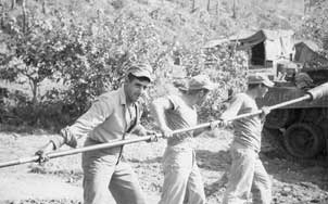 on direct fire missions, returning to the CP to load up, gas up, clean weapons and do maintenance on the tank." Adjacent to Tank A-41 was a US Army field artillery unit of "long toms" [a type of long-range gun]. Sarno said, "When they had a fire mission, the entire deck would tremble. The rest of this battle-scarred valley contained the entire 11th Marine Artillery Regiment of 105’s and 155’s. It was a reassuring vista to look out on tons and tons of artillery pieces for miles and miles. One bright chilly morning, I noticed this Marine jeep coming over the skyline and towards our area. Upon the jeep’s hood were two cruddy North Korean prisoners lashed to the windshield." He said that two Marine military policemen were escorting the prisoners to Division, which was way in the rear. "Suddenly," he said, "I heard these loud roaring sounds in the sky above, ending with hellacious explosions. My day of reckoning was at hand--it was gook incoming and plenty of it. I hit the deck fast and remained there flat as a bastard." Two other crew members, Sergeant Holler (tank commander of A-44 and a World War II veteran) and Pfc. Barr, were by him. "We couldn’t get into the dirt deep enough," Sarno recalled. "The ‘incoming’ was falling all around us. We could hear the hot shrapnel whizzing from all angles." Sarno crawled to the dozer tank, where Corporal Blasi (a strong kid from Kansas who was the assistant driver) and Sergeant Burke (a Marine tanker who had seen action at Inchon-Seoul-Chosin) dropped the driver’s escape hatch. "Punchy [gunner on dozer tank A-44] and I got up into the turret and looked out the periscopes. Hot lead was zinging off the turret as the incoming exploded." Sarno said that he could see the pasting going on below them. "We had a grandstand seat, viewing hit after exploding hit raining down into Artillery Valley. There were black oil clouds, air explosions, and ammo dumps hit," he recalled. "This gook forward observer [FO] was good, and he was having a field day on all of us in the valley. The command diaries read that seventy rounds of 122mm rained down on us that day. Much later, we learned the FO was captured and word had it, he was a North Korean Major."