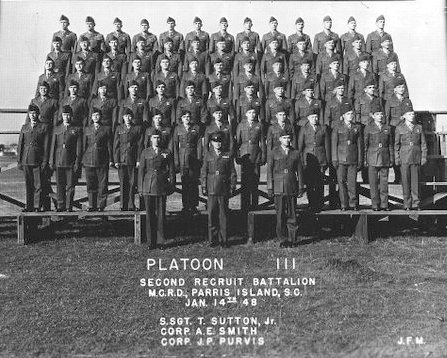 If I remember correctly, boot camp was nine weeks and I was in Platoon 111. Our heads were shaved, and our clothing, shoes and field gear were thrown at us. Everything was too big--for me, anyway. We put everything into our seabag, except our rifle, marched to our barracks, and were taught how to make a bed with hospital folds drawn so tight the DI could bounce a coin off of it. Our days were regimented. We took showers at night and then were up at 0500 by lights coming on and the DI blowing a whistle and yelling. We made our bunks, washed and shaved, fell out for roll call, and had physical training. We were then marched to chow. If we let the mess hall staff put anything on our tray that we didn't like, we had to eat it anyway. All trays had to be clean. The barracks were kept clean by each man keeping his own area clean. If anyone failed to keep his area spotless, he used a toothbrush to clean it the next time. In the evening, lights were turned off at 2200 hours, but sometimes the DIs got us up to go out for exercise, close order drill, or a 20-mile hike. They needed no reason. Corporal punishment was sometimes used. In 1947-48, a DI could grab a boot and slam him against the wall, throw his rifle at him, or even knock him on his butt. They only did this to screw-ups, however. Those who were too slow or who did not follow orders paid the price. I made the unforgivable sin of calling my M-1 rifle a "gun" to the DI once. We put a table in the middle of the barracks and I had to stand on the table with my rifle and repeat this two-liner over and over for an hour while pointing to the appropriate item (my weapon or part of my anatomy): "This is my rifle, this is my gun. This is for firing. This is for fun." I learned the difference during that hour. That was the only time I got into trouble with the DI. Another "shithead" lost the key to his foot locker and he took my place on the table. His two-liner was this: "I'm a shitbird from Yemassee, because I lost my locker key." I'm sure he learned to keep up with his locker key after that. One boot caught smoking in the head had to dig a hole 2x2x2 feet, then bury the butt and dig it up the next day with the DI watching. One boot broke a window. No one would tell on him. The DI got us on the parade field, rifle at port arms, and ran us around it six or seven times. The DIs had to be strict. Their discipline was not only individual, but also a collective type. They said it was to teach us teamwork. If one was in trouble, all were in trouble. We all made it out of boot camp, as I remember. We were fed well in boot camp, though the taste was kind of bland. We were fed the usual soups, stews, pork chops, and yes, steak, too. We were also served vegetables in season, potatoes, and, of course, fish on Friday. In classroom we learned the Marine Corps history and traditions. We saw weapons films, a few battle films, and films about Marine and Navy heroes--General Vandergrift, Chesty Puller, Admiral Nimitz, and others. The ones that stuck out in my mind--and still do--were the informational ones about General Vandergrift and Chesty Puller. The general was Commandant of the Marine Corps when I enlisted, and I served with Chesty in Korea prior to his becoming a general. Outside of the classroom we learned discipline, how to march, how to take care of our weapons, and how to fire on the range. We had to be qualified with our weapons, gas mask, weapons cleaning, bayonet, and hand-to-hand fighting. For the gas mask, we entered a chamber filled with gas, with our mask on. About a minute later we took off the mask and had to sing the Marine Hymn before we exited the chamber. Parris Island was a low, salt-water, marshy island surrounded by water in the Beaufort area of South Carolina. Sand gnats or fleas would get on us and bite like crazy. We couldn't move to get them off so we just endured. When those gnats were biting and when I was showing everybody the difference between my rifle and my gun, I was sorry that I had joined the Marines. But near the end of boot camp, when I knew that the DI's training was to help me stay alive in combat, I came to appreciate my drill instructors. The training paid off for me in Korea. There is absolutely no doubt at all in my mind that I am alive today because of my boot camp training. In combat my mind seemed to bring back things we were taught in boot camp by our DIs and by other trainers during advanced training after boot camp, especially in hand-to-hand combat. It works. Did we have any "fun" at Parris Island? Surely you jest. "Fun at Parris Island?" Not hardly. If we cracked a smile, we hoped to god the DI or some other NCO didn't notice. Church was offered, but I don't recall anyone going. I never did, but we could go if we insisted. (Who was gonna do that at Parris Island?) The last day after graduation, when the DI said, "Dismissed and good luck", was the only "fun" I remember at boot camp. When I completed boot camp, I knew I was a Marine. (I would be an even better one later--a lot better.) We were like honored guests that last day. We were given a certificate, a picture of our platoon, and I was promoted to PFC. For me personally, the long hikes with full field packs and learning all of the general orders had been the hardest thing about boot camp. When it was over, I had grown up quite a bit. I knew how to use weapons if I had to, and I knew how to look sharp. I went home on boot leave for 20 days. I just hung around my family and wore my uniform some. All commented that I looked good. When leave was over I went back to Parris Island and was three hours late getting back because I missed the bus in Beaufort and had to hitch hike. I was lucky. They let me go free. From Parris Island I was sent to Treasure Island, California by troop train. The train stopped three times in different cities. We all got off and exercised about thirty minutes or so. I remember that El Paso was one of the stops. Japan to ChinaIn Calif