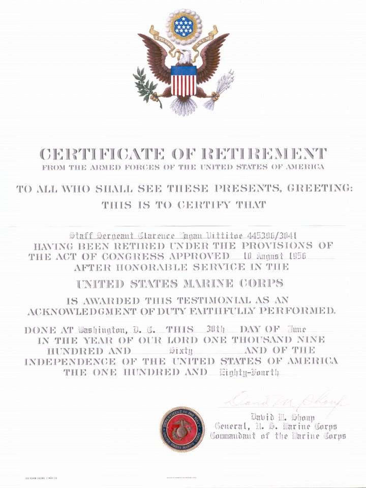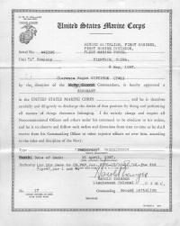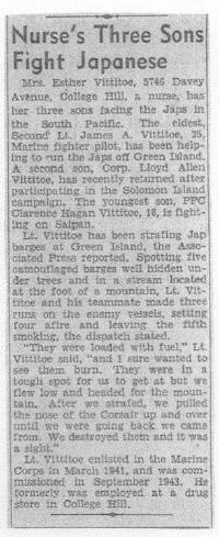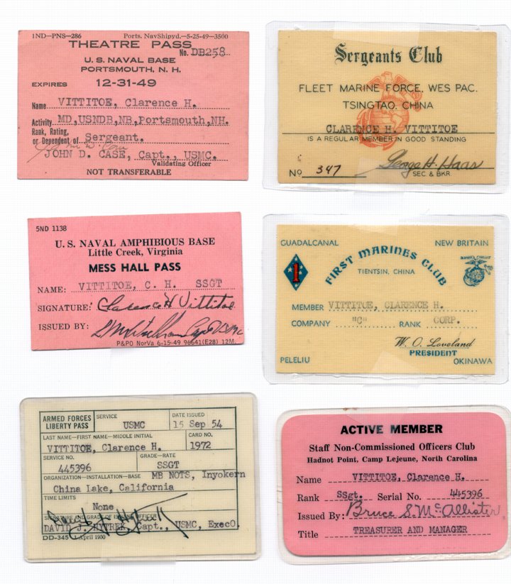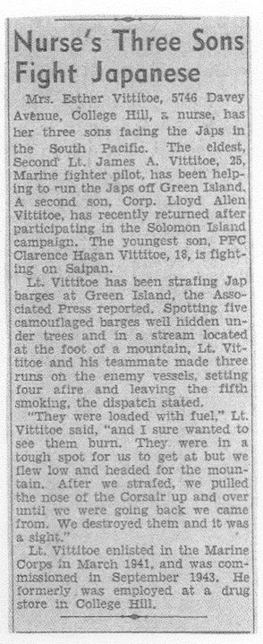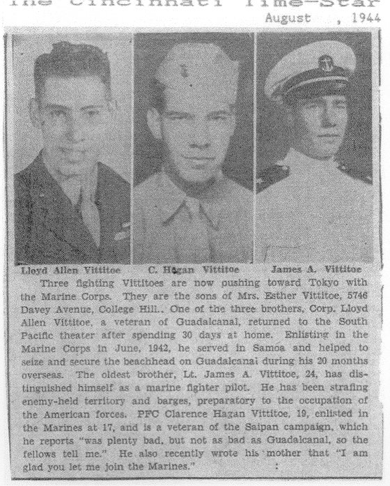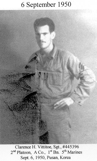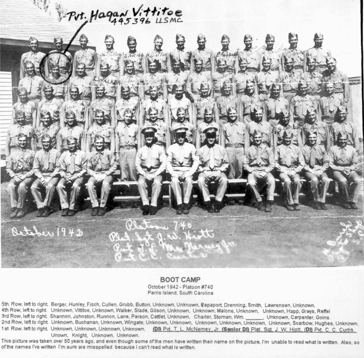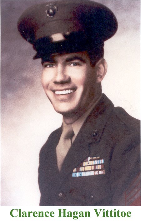 Pre-MilitaryI was born Francis Hagan Vittitoe on September 6, 1925 in Cecilia, Hardin County, Kentucky, the third son of James Lafe and Esther Hagan Vittitoe. That is, I thought my name was Francis until I got my birth certificate in order to join the Marine Corps. At that time, I found out that my real name was Clarence Hagan Vittitoe. I have never been called either Francis or Clarence. When I was born, it seems my brother Lloyd Allen could not pronounce Hagan, so he called me Hagie. Therefore, all during my childhood, I was called by that nickname. At the time of my birth, both of my parents worked at the Indiana State Hospital in Richmond, Indiana. There was no cash money to be made in or around Hardin County (or in Kentucky, for that matter), so they had to go to Indiana to make a living. My mother was a Practical Nurse. I'm not sure what Dad did, but I believe he was some kind of male nurse. I'm not sure just when they started working there, but it was before they were married--a few years before World War I (about 1915), I think. There were several people from Hardin County that went to work at the hospital. There was no money to be had in Hardin County at the time. The pay at Indiana State Hospital, although low, was better than nothing. Although my parents lived in Indiana, Mom went home to Kentucky to have her children. My brothers were James Albert Vittitoe, born March 15, 1920 and Lloyd Allen Vittitoe, born August 25, 1923. Both of them were also born in Cecilia. While my parents worked in the hospital, my brothers lived with "Papaw" and "Mamaw" (our grandfather Thomas Geoghegan Hagan and grandmother, Mary (Mollie) Harding Hagan). After my birth, Jimmy and Lloyd Allen still stayed with Papaw and Mamaw, and I went with Mom and Dad to Indiana. I remember very little of my early life, but have been told that I boarded with several different families for the next few years while living in Indiana. When I was about five years old, we went back to Kentucky, and all three of us boys went to live with an Aunt and Uncle. They were not really our Aunt and Uncle, but distant relatives of Dad's named Yates. I got some of our Vittitoe family information from Ina Yates Atcher. They lived around Rineyville or Vine Grove in Hardin County. I'm not sure just how long we stayed with them. At the height of the Depression, I think around June of 1932, my two brothers and I were admitted to the "Kentucky Baptist Children's Home" in Glendale, Kentucky. This Home is now called "Glen Dale" and the name has been changed to "Kentucky Baptist Home for Children." There were about 100 boys and 100 girls living in the Home at the time, ages about one month to eighteen years of age. Our Dad was an invalid (due to epilepsy), and had been admitted to a hospital in New Castle, Indiana. Mom couldn't take care of us three children, so we were sent to the Baptist home. Jimmy was about twelve years old. Lloyd Allen was eight. I was six years old at the time. I don't remember too much about life at the Home. At the time, I didn't think it was too happy. But looking back, it was a pretty happy childhood. We had electric lights, central heat, indoor plumbing, and plenty of good wholesome food (beans, blackberries, bread and milk). This was more than most Southern Baptist children living in Kentucky could say at the time. This was during the Depression years of the 1930s. Jimmy stayed there for about four years, and when he left the Home, he stayed with Mr. John Gardner, teacher and basketball coach at Glendale High School. (Boys had to leave after they turned 16 years of age. Girls could stay until they turned 18.) He played basketball for Glendale the next four years until the spring of 1940, when he graduated. Lloyd Allen and I stayed at the Home until about June 1941. At that time, Lloyd Allen got a job with Reynolds Jackson, a former resident of the Home, in Dover, Delaware. I went to live with Mom in Newport, Kentucky.