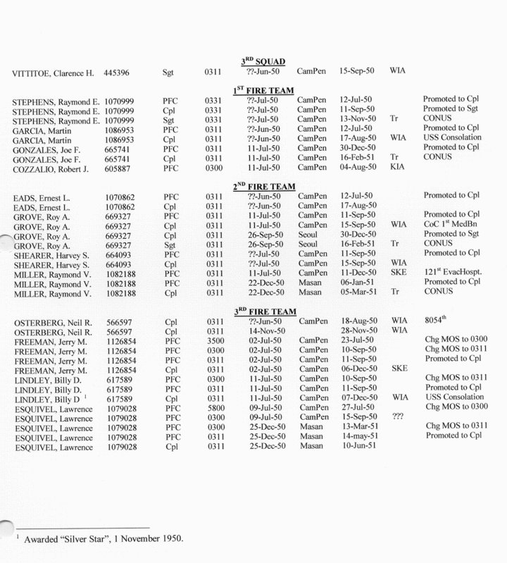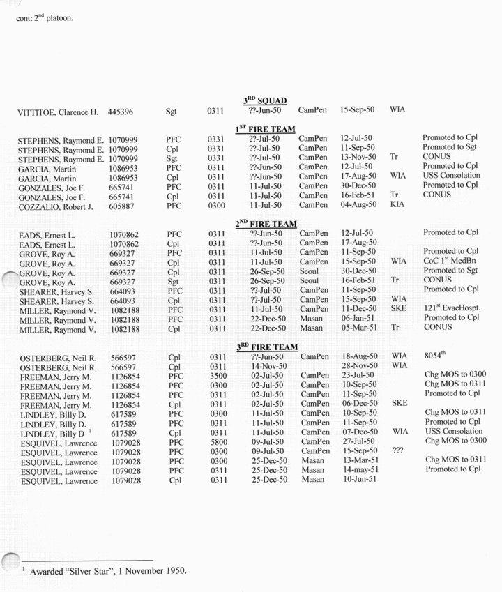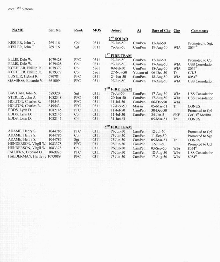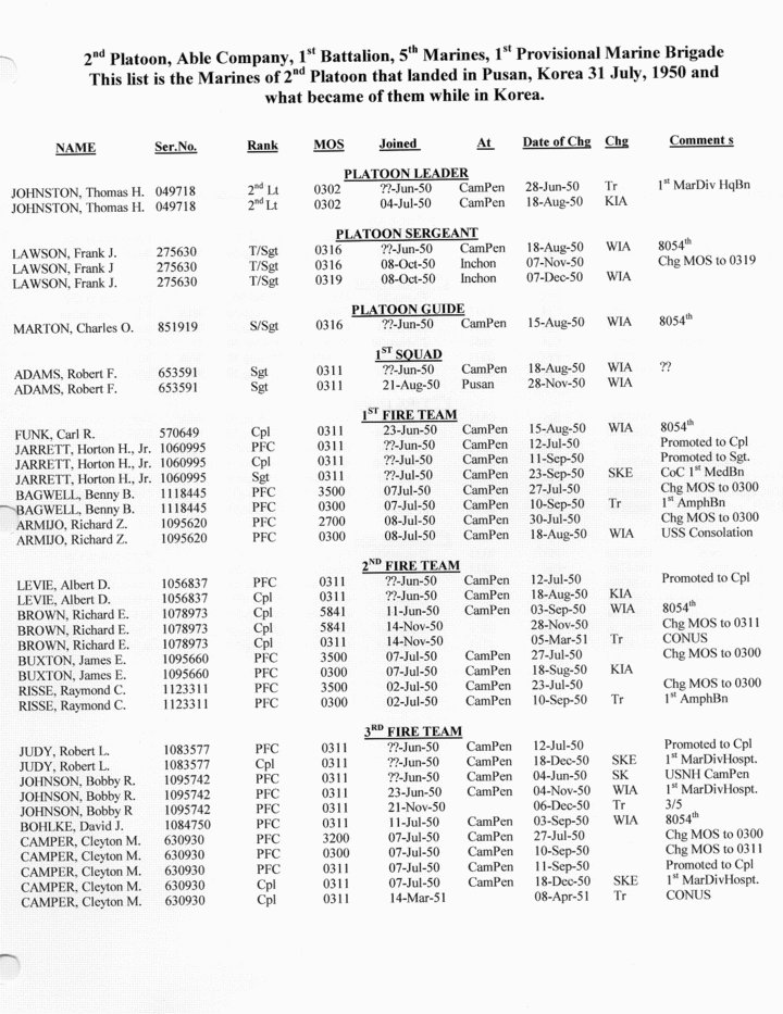 I am a veteran of two wars, but the difference in the two wars and my experiences in each of them cannot be easily explained. During World War II, I was an 18-year old Private and assistant BARman. I didn't know what was going on around me. I just did what I was told to do and hoped for the best. In Korea, I was a 24-year old Squad Leader who had been in the Corps for eight years. Lieutenant Johnston tried to keep the squad leaders informed of what was going on and what was expected of their squad. He pretty much kept us abreast of the situation as he knew it. As a Platoon Guide after S/Sgt. Martin was wounded, it was my job to make sure the men of the platoon had everything they needed--ammo, grenades, helmets, rifles if necessary, shoes, socks, and especially canteens and water. In battle you can lose or damage any item beyond repair. In each new war, the terrain is different, the climate is different, the enemy is different. But when someone is shooting at you, combat is the same in all wars. I'm sure the Marines in Iraq feel just the same as the Marines did in World War II, Korea, and Vietnam. Those who got out of the service may have been treated differently after each war, but not those who stayed in the Corps. I've enjoyed the treatment and respect I have received from those whose opinion mattered to me. I was a career Marine and the Marine Corps is a small military organization. The Marines I knew, I knew by their rank and/or last name. I knew very few Marines by their first name. Those of us who stayed in the Corps moved from unit to unit and after a few years at each move you met someone you had served with before or someone who had served in the same outfit. You're never with strangers while serving in the Corps. I don't believe that going to Korea changed me. However, it did let me hold my own in the sea stories told in the slop-shoot. I am not, nor have I ever pretended to be, a hero outside the slop-shoot after downing a few. I've always admired others who could state with a straight face, "I was no hero. I only killed 50 of the enemy with my bare hands, but the real hero is my buddy who was killed." As for me, I did enough to hold my own with sea-stories after a few beers, and not laugh out loud when another Marine told how he was shot between the eyes and the bullet went straight through and came out the back and how he had to beg the Corpsman not to evacuate him but patch him up and let him get back into battle. (I'm being facetious here.) I have no desire to go back to Korea. Lieutenant Muetzel once told me that he revisited the place and recognized nothing that he remembered. At Inchon, Cemetery Hill had been leveled and the harbor extended by fill out about a thousand yards. The seawall was gone, too. This didn't disappoint him necessarily. He just found it different from what he had remembered. Final ReflectionsI think that the United States was right to go to Korea in 1950. It served the purpose it was designed to do. It stopped the expansion of communism for a time. In hindsight, perhaps MacArthur should not have gone north of the 38th parallel, but he couldn't or didn't foresee the entry of the Chinese into the conflict. If they hadn't become involved, MacArthur would have been hailed as a military genius again. I also feel that the US was right to maintain troops in Korea. I believe that without American troops there, the North Koreans would have tried again to take over South Korea. In doing so, if no Americans were killed, I don't believe the American people (Congress) would support another war with North Korea. In my opinion, the serious mistake that the U.S. made at the time of the Korean War was allowing the Army to drop its guard and the Officer Corps to rest on its laurels after World War II. They quit training for the next war and thought their exploits in the last one was sufficient to scare any enemy into surrender. I can remember the story of Army General Dean going into the front line with his troops and firing his rifle at the enemy. For this he was (so I read) given a medal. Had a Marine General done something like this, he would have received a Court Martial. This was a time when the Army was in dire need of leadership, not another rifleman. Another mistake: I believe that if General Walker had not been killed in a vehicle accident and been replaced with General Ridgeway, the American Army would have been driven out of Korea. When General Ridgeway took command (he fired a number of senior officers), the retreat of the Army stopped and held, then counter attacked with success. "The Forgotten War" is just a catch phrase used by some journalist. Then again, it has been a long time since it was over. Also, we didn't win. I think in a lot of ways we are ashamed that we were unable to get closure with our mighty Military against an enemy that had neither an Air Force nor a mighty Army. We settled for a cease fire. I have never told family members or anyone who is not a veteran about my Korean War experiences. Since retiring from the Corps, I haven't lived around a military base and haven't associated with other Marines. About the only time the subject would ever come up would be after a few beers talking to others that have had similar experiences. No use telling a sea-story if the other party can't grasp the tale, enjoy the story, and perhaps top it. Always a Marine and Proud of ItBeing in the Marine Corps shaped my whole life. I joined the Marine Corps as a 17-year old youngster without an education who had never been more than a few miles away from home by himself. In the Corps I became a world traveler. I came to appreciate more the things that we have here and just how generous the American people can be. The love of Country was instilled in all of us at an early age, but I believe life in the Marines enhanced this love--for me at least. I belong to the 1st Marine Division Association; 2nd Marine Division Association; China Marine Association; Able 