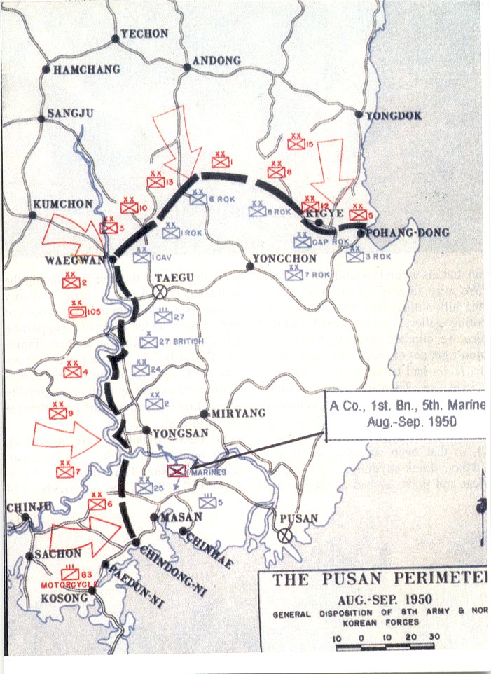 I stayed at the Prison until the spring of 1949 - about April - when I was transferred to the U.S. Naval Ammunition Depot in McAllister, Oklahoma. The Depot still exists today, but under the name McAlester Army Ammunition Plant. This was really good duty, but again you couldn't stay at a small station for very long. I was at McAllister until the following spring when I was transferred to the Fleet Marine Force (FMF). Then, about May/April, I was transferred to the 2nd Platoon, Able Company, 1st Battalion, 5th Marines, 1st Marine Division, Camp Pendleton, California. As I remember, we only had 30-35 men in the platoon. Generally, a few of these were on leave, TAD, or in sick bay. This was better duty than I had expected. We were out charging over the hills daily, fighting aggressors, climbing mock-ups, and climbing down cargo nets almost daily. However, we had most every night off and every weekend, Camp Pendleton is located about half-way between two of the best liberty cities in the States. Why did I rejoin? After you've been in the Corps for a few years, you never join an outfit anymore as a stranger. There is always someone you know well or someone who knows someone you've known well. It becomes a way of life. And I enjoyed being a Marine. With the exception of Sea Duty (which I didn't like), I never had what I would term "bad duty." Of course, I didn't like being shot at, but you had to take what was issued and move on. If I had it to do over, I'd ship over again. War Breaks OutI got to Pendleton in March and the Korean War broke out in June while I was involved in infantry duties. I knew nothing about Korea, and I didn't want to go to war, but if the Marines went, I wanted to go with them. I followed the war news by radio and newspaper, and, like MacArthur, I thought that it would be over in a hurry. Marines with far better memories and writing skills have written all about the Korean War. They remember who, what, when, where, and why. I remember very little of what was going on during this time. From about the middle of June to the time we sailed for Korea was a time of confusion. We were receiving replacements daily. Also, some that had been TAD were returning to the company. One such was S/Sgt Charles Martin. I had been Platoon Guide since I'd joined 2nd Platoon, but when Martin returned from TAD, he being senior to me became Platoon Guide and I became squad leader of 3rd squad. Before the war, we didn't have a 3rd squad. When the Brigade started its build-up, we had Marines come out of the woodworks. Some came from guard units all over the western United States, and even some reserve units were called up for active duty. Some hadn't been in a line company for several years, and some had the wrong MOS. These Marines may have had to take positions under Marines of lower rank than themselves. This didn't last long since all Marines are infantrymen first. By the time we arrived in Korea, they were in the position their rank called for and able to handle the position well. I had no wife, and I had no car at the time I shipped out to Korea. My personal preparations before leaving were to pack my sea bag and ship my civilian clothes home to Mom. I called her and told her I was sending her my civilian clothes and that I was going overseas. At the time, we thought we were going to Japan for more training, but I think that Mom was a little worried. I'm not sure of the exact date we left for Korea. It was in the middle of July. We were aboard the USS Henrico. I have no idea how many troops it could hold, but it was a crowded troop transport filled with the men of the 1st Marine Provisional Brigade and their equipment. Only Navy and Marine personnel were onboard, and the cargo was our equipment. Our Commandant, General Clifton B. Cates, was at dock side to bid us God speed. This was the first time I had seen a Commandant or a four-star Marine General. I think he was talking to me personally when he said, "Clean up that mess in Korea soon or I'll find out why." He never had to go to Korea. My sea bag never got to Korea, either. It was supposed to join me in Japan, I believe. But since we didn't go to Japan, I never saw it again. I've always enjoyed blaming the Navy for this mix-up. My sea bag had all of my uniforms in it, but nothing of value that couldn't be replaced easily. I've always traveled light. Trip to KoreaThe Henrico was an older ship that had been used in the Spanish American War around the turn of the century. Shortly after leaving the port, we had to go into Oakland for repairs. As a Sergeant, I had no idea what repairs were needed. The Marines aboard claimed it was because there was a movie showing Bert Lancaster that the Captain wanted to see, but this might be stretching it just a little. I believe we were in Oakland for about 24 hours or so. I don't remember if we caught up with the other ships in the convoy, but we all arrived in Pusan about the same time. There wasn't much to do on the trip over. We saw a few movies on the fantail. We did calisthenics when we could find space topside--most anything rather than lay around all day. We had no duties, but Lieutenant Johnston and Gunny Lawson held several lectures on various subjects. I think it was more to have something to do than to impart something of use. No one knew much about Korea, and I believe most of the lectures given were guess work. They were about climate, terrain and the varmints we might run across. We knew almost nothing about the North Korean Army. Lieutenant Johnston had not been in World War II, but he was a very smart officer and could have given an interesting lecture on almost any subject. Gunny Lawson had been in several battles during World War II, and tried to explain what he could about an armed enemy-any armed enemy. I don't believe anyone can explain the horrors and fears of war. You have to live it to understand it. I was soon to discover that the training I received in basic and advanced trainin