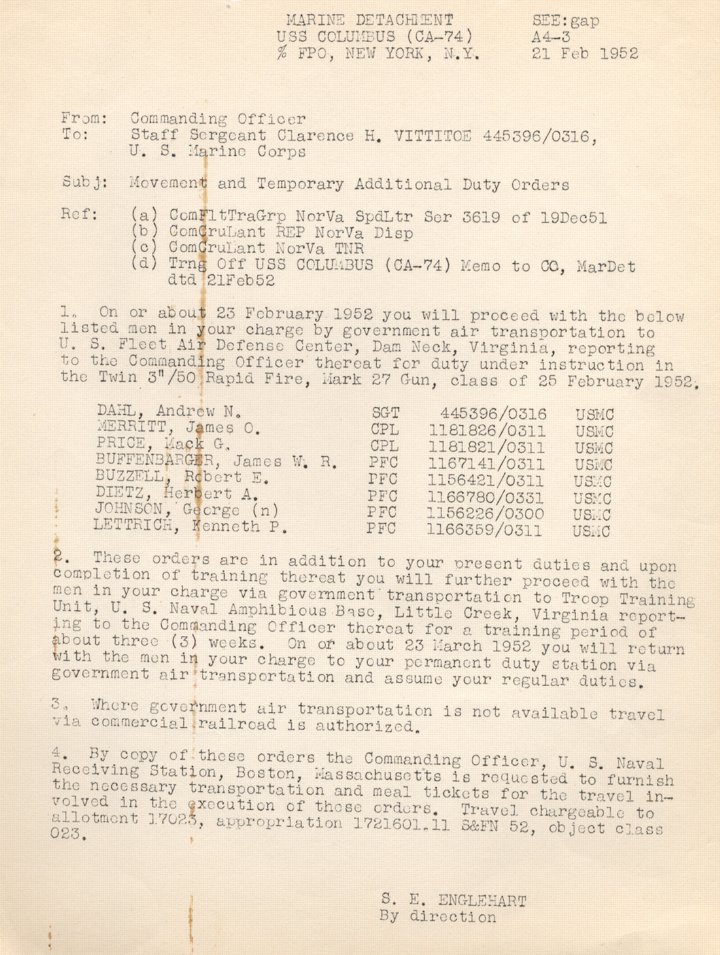 ![]() Hagan Vittitoe, 1952 Marine detachment, U.S.S. Columbus (Click picture for a larger view) |