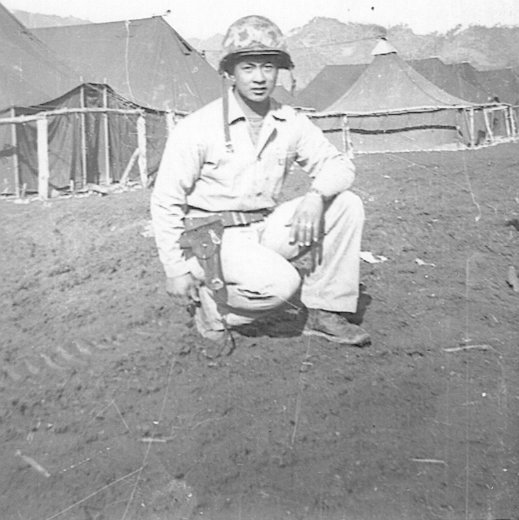 During the winter, we stayed in fighting positions on the reverse slope of hills. When we wanted to see what was going on, we would creep up to the top of the hill and make our observations. We didn't want to be on the forward slope of the hill since that would have made us easy and predictable targets. I often had to go down the back side of the observation hills we were on to get water. By the time I returned, the water was partially frozen in my canteen. Any water that had splashed on my body while collecting the water was frozen to my uniform. That's how cold it was. The winds were intense and blustery. As a result, everything froze quickly. The weather was awful and made combat even more miserable than it already was. The cold temperatures affected our weapons, especially if any moisture got into the operating parts. The gunfire mechanism would freeze up causing malfunctions. That never happened to me since I always tried to keep my weapon close to my body so that it would be relatively warm and dry. Taking a Hazardous TumbleI remember that when I first arrived in Korea, I didn't even know where the front line was. Shortly after arriving on the front our Marines caught two large Korean prisoners. They must have come from the north. It seems that in every country, the natives in the north are always bigger than those in the south. They wanted me to be a prisoner chaser that day. In other words, I was like a deputy sheriff, taking them back to our secured rear area. These particular prisoners I was escorting were walking in front of me. We made this particular sojourn at night. I had my trusty .45 drawn as we walked along a ridge line in pitch black darkness. It was the first time I had to draw a weapon for real. (I had never even hunted in the States!) But here I was, a "raw" boot escorting enemy combatants through the dark with a .45 drawn to protect myself. If the prisoners did anything I was expected to shoot them! As we walked back to the rear, I could barely see my prisoners. Here I was, an average size Chinese-American bringing back two large Koreans. The Marines in my unit couldn't tell if I was friend or foe. I kept yelling my password all the time. I spoke English out loud, even though it was just to myself. I wanted to make sure everyone in the rear knew which side I was on. Had a rear area guard seen us, I'm sure I might have been mistaken as an infiltrator and been accidentally shot. Being Chinese made me more cautious because I didn't want to be hit from both sides. During World War II, they didn't generally send anyone to the country of their origin to fight. For instance, the 442nd "Go For Broke" U.S. Army Division, which was composed of Nesi (Japanese American), were sent to fight the Germans, not the Japanese. They became one of the most decorated divisions in the Army during World War II. Almost everyone of Asian descent was sent to Europe to avoid any confusion on the front lines. But here, talk about confusion! During the night of my escort of the two Korean prisoners, visibility was very poor. We did not see a large bomb or artillery crater on our path. Next thing I knew we all stumbled and fell into the crater together. One prisoner fell below me, while the other fell on top of me. The prisoners could have killed me. I considered pulling the trigger of my .45, but there was no ensuing struggle. Everything happened very fast. I did not want to kill them, but I could have. Obviously they wanted to be taken as prisoners because they did not put up any fuss or fight. There was indeed a lot of confusion. They were yelling this and that, but I didn't understand Korean. They quickly got up and continued walking. I was very much in command. I yelled, "Get over there or Ill shoot you!" But I was just saying that for my own purpose. They couldn't understand what I was saying. I just wanted to yell loud and show them I meant business. That was my first face-to-face encounter with the enemy. It was up-close, personal, and VERY scary. As we got closer to our area, I kept yelling the password. I didn't really know where I was going except that I was heading in a steady direction. I finally got to the Military Police who were waiting. Everyday LifeMy brother was a dentist, so I acquired the habit of brushing my teeth every day, even on the front lines of Korea. In the wintertime, I used to take snow and ice and put it in my mouth to brush my teeth. Very seldom did we clean up. We would go for months without a bath. I've got pictures of my face with several days worth of dirt on it. You would think, from the picture, that I was a car mechanic. Although we were on the front lines, we still got our mail. That was our lifeline. My friends sent mail to me. My mother couldn't read or write in English, so my letters home to her were always interpreted through one of my sisters. I told my mother that I was in California and having a good time. I did not tell her that I was in a war zone. When I finally came back home, I did tell her, and she got mad at me. She said that she had a feeling something wasn't right because I never called her on the phone. My sisters knew. It occurred to me that if I had been killed in action, my mother would have been in a bigger state of shock since my letters indicated I was stateside. But I took my chances. I did not want her to worry about me. My mother was very attached to her family. My oldest sister is 20 years older than me. She is 89 years old, as of this interview date. Because of the age and roots difference, it is almost like there were two sets of families. My sisters would send "care packages" to me during my time in Korea. They would send dried food, candy, gum, nuts, certain baked cookies, etc. I never asked anyone to send me anything. But my sisters, friends, and neighbors took the time to show they cared, which I greatly appreciated. I wasn't looking forward to the food as much as I was the mail. Everybody was hungry for mail. Whenever th