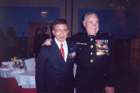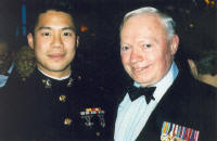 At first, I didn't know of David's whereabouts. But I knew he was there. At that time, you could call a toll-free overseas number. You could call up his outfit, give his name, and find out if he was okay. At every opportunity I called the number and asked about Lieutenant David Wong. They told me he was fine. That known, I could relax for that moment. Because I know how unpredictable combat can be, I remained very edgy. I would have gone over there in a heartbeat, but when it is you own child, it is different. David eventually came home safe and sound. We were very excited when he arrived. He flew into Camp Lejeune. We drove all night to North Carolina to see him and his fellow Marines, who marched onto a parade field for a review. I couldn't believe he was finally back in the States. It was very much a moment of pride for me. He had performed well. He is a perfectionist. Right now he works for Merck Pharmaceuticals, traveling all around the wonderful country he once helped defend. Final ReflectionsI was so busy after my discharge that I never had any dreams or nightmares about Korea. A lot of things were shut out because I've gone from one thing to another. I had to concentrate on my college studies and football, my family, my work. Everything about Korea was out of my mind for so many years. I didn't really remember too much about the experience. But one day, while looking through some old scrapbooks, following my retirement, I started wondering about whatever happened to this person and that person. The curiosity began channeling memories back that I had long forgotten. The questions asked in this interview [1999] have caused me to wonder, and remember, more. People haven't asked me a lot of questions about Korea, so I have to take the time to think back and reflect first. Certain things remain vague, but some things come charging clearly back into my mind. I regret that time has caused many friends to pass away since the war, and that I didn't have a chance to renew great friendships born of comradarie and shared experiences. My children are patriotic. I have told them about serving in the Korean War, but it didn't mean much to them. I didn't go into any details because I never felt they would be interested. I also didn't think sharing the horrors of war was necessary for them to hear. I tell them going to Korea was an eventful experience that I am proud to have participated in. I am honored that I was able to serve my country and help arrest the spread of communism. Going to Korea gave me a unique perspective on my own country. I appreciated the fact that we were concerned enough to send troops to Korea to fight communism. I have always felt we were doing the right thing. The fall of communism during the 1990s validates that feeling. I believe we won the war in Korea, despite the fact that many still refer to it as a stalemate. Today South Korea has a stable and dynamic country. It is a free and democratic republic, while the northern half of the peninsula remains under a brutal dictatorship. The Korean War was not a "Police Action." The Korean War was one of the worst wars in the 20th Century, as far as deaths casualties per year. U.S. worldwide casualty figures for the Korean War were 54,246 during 1950-1953. For the Vietnam War it was 58,135, between 1965-1973. World War I saw 116,708 die from 1917-1918. World War II figures list 407,316 from 1941-1945. The heaviest losses for the Marine Corps in Korea occurred during the Chosin Reservoir campaign. Marines who fought after Chosin also incurred heavy losses. High intensity battles like Bunker Hill should not be forgotten. All the various campaigns were part of something bigger. All Marines fought bravely. We fought, bled, and often died under grueling conditions. Once a Marine..."Once a Marine, Always a Marine" is very true. I can go up to just about any Marine and talk for hours. A Marine Corps general once told my wife that he missed many airline flights because when he started talking to Marine veterans he'd run into at airports, the next thing he knew, he had missed his plane. I started going to the 1st Marine Division reunions last year. I attended the Philadelphia reunion in 1999, and the Cincinnati reunion in 1998. I am planning to go to a reunion of the Force Recon. I belong to the Marine Corps League, the Order of the Purple Heart, the 1st Marine Division Association, American Legion, Force Recon Association, and the VFW. I am most active in our local Marine Corps League chapter, the "Nittany Leathernecks" which is composed of active duty, retired, and Marine "veterans" like myself. We are an active organization dedicated to community service. Our motto is: "Valiant service is not limited to combat." My best friend Lynn Hook and I were instrumental in forming the Nittany Leathernecks Detachment from its early beginnings in the State College area in 1974. I was awarded a Life Membership in the Marine Corps League in recognition of my "outstanding member recruiting efforts". It was the first time this honor was afforded to a detachment member. I have also been nationally recognized by the Marine Corps League for my detachment historian efforts. I am also a military paraphernalia collector. When I was young, I was very interested in the military. I used to save patches. At the time, I only had to pay five cents a patch. Now those things can sell for as much as $100 -- even more if they are particularly unusual patches. I collect anything that's military, but mainly World War II and Korea items. I have a few things from World War I, but I am not really interested that much in that war. Since the Korean War was so close to World War II, there is a lot of similarity in the equipment since so much used was surplus WWII clothing and equipment. I collect uniforms, hats, bands, stripes, chevrons, patches, shoes, from all branches of the Armed Forces. But I particularly collect Marine Corps items. Military museums sometimes ask me t
