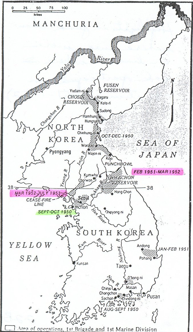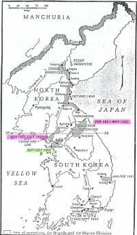 When we disembarked from the ship, it was already nighttime. This reminded me of World War II, from what I had read in the papers and heard on the radio. We had dimmed-out lights on the trucks, which meant there was only little slits over the headlights. One truck in our convoy drove off the mountain that night because the driver had no visibility. It was real late at night when the whole convoy stopped, due to the accident. We were not aware of what had happened at the time. Of course everyone was wondering what the hold up was all about. Word finally came back that the truck went off the road and that there were fatalities. Even though we were nervous about the road situation, the scariest part was that we had friendly artillery firing over our head. We couldn't tell the difference whether it was incoming or outgoing. When the artillery battery fired over our head, I thought we were being shelled. As a burst of artillery went over our head I thought we were going to die because there was a very loud BOOM directly over us. We soon learned the difference between incoming and outgoing artillery. Before long you became numb to it all. And being so tired we'd eventually fall asleep. Those of us who weren't officers did not know what was going on. In retrospect, I sometimes think maybe it was better we didn't know what was going on. We just followed orders. I was only a PFC then! The morning following our arrival to the front, we were greeted with the arrival of all kinds of wounded Marines. It was the first time I had seen anyone who had been shot to death. I looked at the corpse and wondered to myself "How did this Marine die?" I didn't see any blood. But when they lifted up his jacket I saw a little hole that had penetrated his chest. "So that's what the cause of his death was!" I thought to myself. When you look at something like that, it is hard to comprehend. This was the first time I was truly faced with the reality of war. It scared me. I thought to myself again "That could be me!" It dawned upon me at that moment that this was a real war and, like World War II, I could be here for the duration, which could be a couple of years. I would not be seeing my family soon. I was not even sure I'd ever be going home, except in a box. I decided to put those thoughts out of my head at that point. Assigned to H&SI was assigned to Headquarters and Service Company, 3rd Battalion, 1st Marine Regiment, 1st Marine Division. They were on the front line at that time. I was with S-2, which meant Marine Intelligence. Most of the time that I was in Korea, I was a scout and observer. I also had additional duties. My other Military Occupational Specialty (MOS) was 1441, which was map reading, overlays, intelligence data, etc.. My principal assignment, however, was always a scout and observer. I was to go on combat or recon patrols to obtain combat intelligence and/or capture the enemy soldiers. I spent a lot of time at our various outposts.
