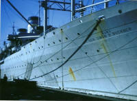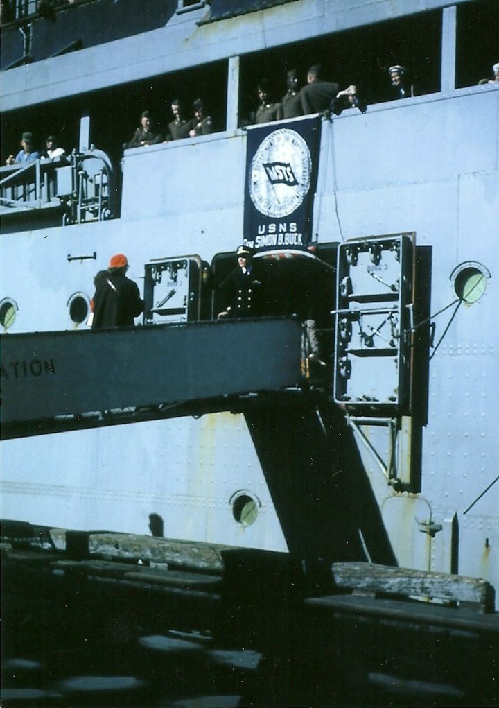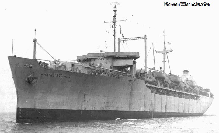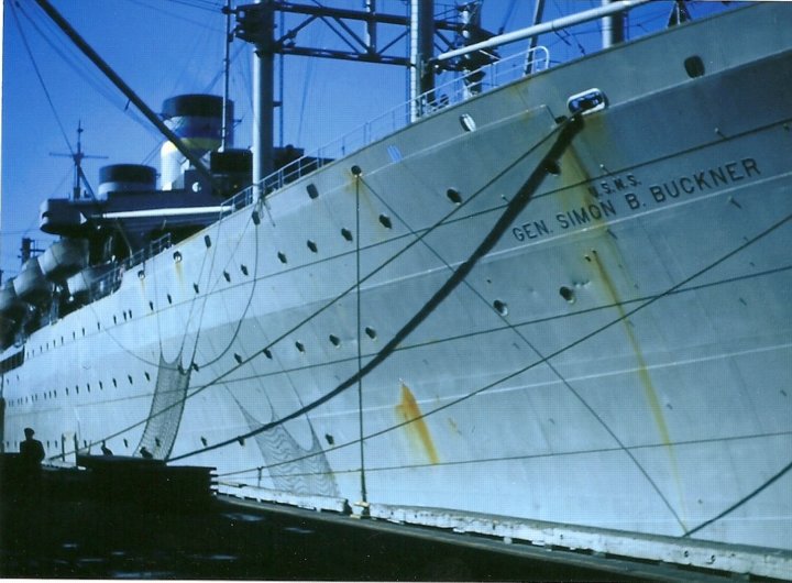 I was transferred from the Consolation on July 30, 1953. I was the only one from the Consolation aboard the Marine Serpent, so I didn't know anybody on that ship. I had over five months left in my enlistment. When I left the Consolation I was a third class petty officer. Aboard the Marine Serpent, I took the test for second class petty officer and passed it. The Marine Serpent was manned by a civilian crew, with the exception of the sick bay. We had a Navy doctor and three hospital corpsmen. I soon found out that I had been assigned to the Marine Serpent, rather than to a west coast Naval base. My wife had already quit her job at the hospital in Los Angeles and had moved to San Jose. She stayed at my parents' home, thinking I would be assigned to a base near my hometown. On the way to Seattle, we came across some very rough weather. I thought the ship was going to split in half. It was even worse at night. I strapped myself to my bunk and was prepared to make a dash to the upper decks and to a life boat if it became necessary. Fortunately, we made it through the rough weather, which lasted for a couple of days. With no stopovers, we still made it to Seattle in about two weeks. When we arrived in Seattle, we were told that we had a one week layover, and that we would be going to San Diego after that week to pick up Marines to transport them to Inchon, Korea. One of the corpsmen aboard the Marine Serpent had his car on base in Seattle, and he wanted to drive to Los Angeles. He offered me a ride to San Jose if I would drive to San Jose while he slept. I took him up on it. We left in the evening, arriving in San Jose early the next morning. My wife was surprised to see me, and we enjoyed our week together. I planned to take a Navy flight from Moffet Naval Air station back to a base near Seattle, but instead I ended up having to take a Greyhound bus back to the base. We left for San Diego, picked up three thousand Marines, and headed back to Inchon, Korea. When we crossed the International Date Line, ceremonies were held. I took lots of photos. The Marines were pretty rough on the new inductees. The trip back to Korea was also rough sailing. We had a lot of seasick Marines. The Marines traveled with full battle gear, and as a result, we had one bayonet stabbing. The doctor was not a surgeon, and I was the only experienced operation technician, but we were able to patch him up and he survived. The other Marine spent the rest of the trip in the brig. When we arrived in Inchon harbor, there was the Consolation. We unloaded the Marines on to floating platforms, and then onto LSTs. The LSTs took them ashore. I made two trips on the Marine Serpent. The first trip we transported Marines to Inchon. The second trip we transported Army troops to Pusan. On the trip back from Korea, we had only one patient--an army captain who came down ill and was admitted to sick bay. He had contracted a disease while stationed in Korea, so I spent long hours caring for him. He died before we got back to the United States. Only after his body had been taken off the ship did I wish I had written down his name and address. I felt that I would have liked to talk to his family about his last days. He talked to me about his family and his hopes for the future. I really don't know if I would have been able to talk to any of his family, though. I probably would not have used the proper words. When we returned to Seattle, I requested my overdue thirty-day leave. It was approved. My wife quit her job as a library clerk in San Jose. She took the Greyhound bus to Seattle, and we rented an apartment for those thirty days. My wife was planning to stay in Seattle since it was my ship's home base. We visited all the places of interest while there. At the end of my thirty day leave, I reported back to the base. The Marine Serpent had already left for another trip to Korea, so I was reassigned to another troop ship, the USS Buckner. USS BucknerThe Buckner was a larger ship which transported not only troops, but dependents of overseas military personnel, as well as some dignitaries. It was more like a cruise ship. I really enjoyed being on it. The only thing lacking was a swimming pool. Its home port was San Francisco. In sick bay we had three corpsmen, one nurse and a doctor. I was the ranking corpsman, so I was in charge of sick call and typing up all the medical reports. For the first time I did not have to stand in line for my meals. We were served and we ordered from a menu. The staff had their own movie room with the latest releases. We picked up passengers in San Francisco and Pearl Harbor and transported them to Yokohama, Japan. My wife would meet the ship when we came in to San Francisco. I made only two round trips on the Buckner. On one of those return trips, I was met by two recruiters who made me a deal they thought I couldn't pass up. They wanted me to reenlist for one thousand dollars, and I would be sent to New York for specialized training so that I could serve aboard a submarine. I would be the MEDIC on the boat. I refused their offer. Post-Military LifeIn August of 1954, I was transferred to Treasure Island naval base for early discharge on August 23, 1954. With three hundred dollars in cash, I was finally out of the Navy. I took the Greyhound bus to San Jose, and resumed married life with Billie, who had already gotten a job as a nursing assistant at the San Jose hospital. I was home barely a week when I went to the fruit cannery where I had worked when I joined the Navy and asked to be rehired. I got on the very same day, doing the very same work I had done previously. We lived with my parents for about a month, when we were able to rent an entire upper flat next to my parents' home. I decided to stay at the cannery until the end of the season and then request a permanent job with the company in the company warehouse. I talked to a couple of high school friends who were year-round employees. They encouraged me to ap