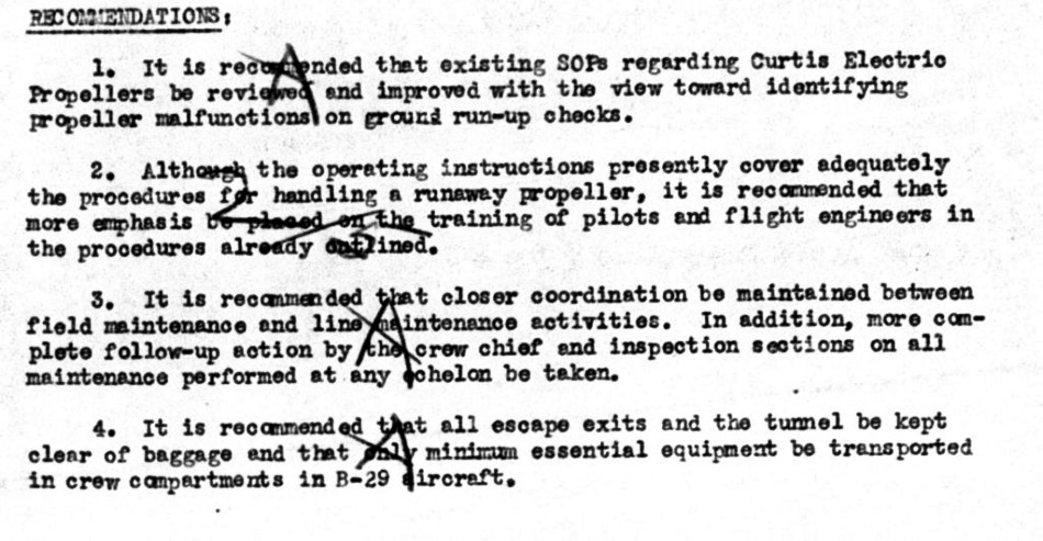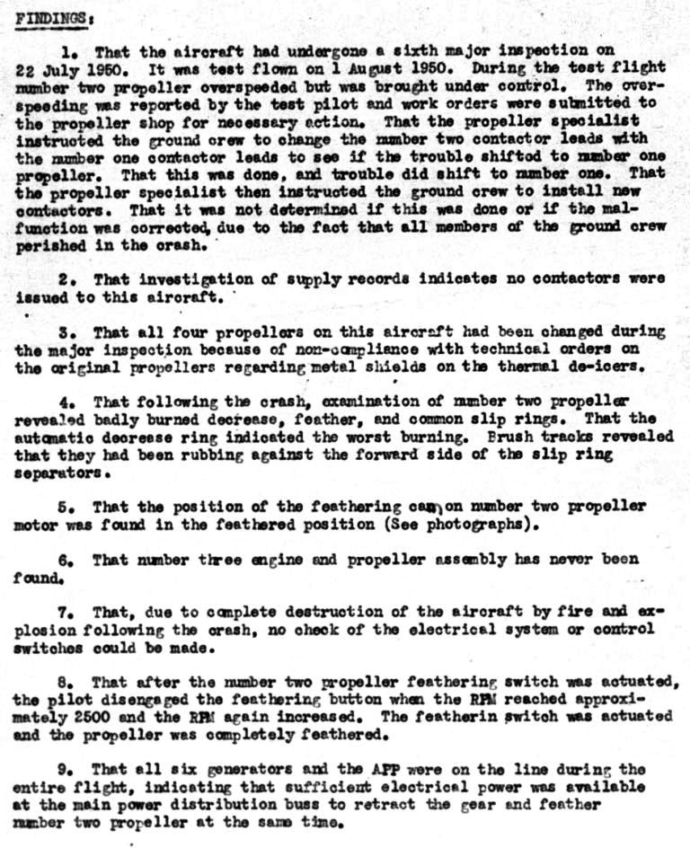 A US Air Force Boeing B-29-85-BW Superfortress, 44-87651, of the 99th Bomb Squadron, 9th Bomb Group, 9th Bomb Wing, carrying a Mark 4 nuclear bomb, suffered two runaway propellers