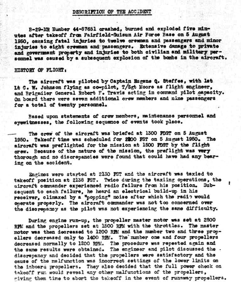 Late in the evening of 5 August 1950 the lead plane of a fifteen-plane flight of B-29s lost control of an engine during take off from the Fairfield-Suisun Air Force Base.