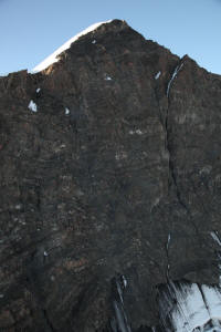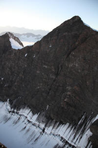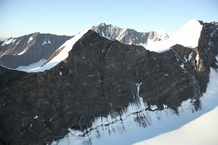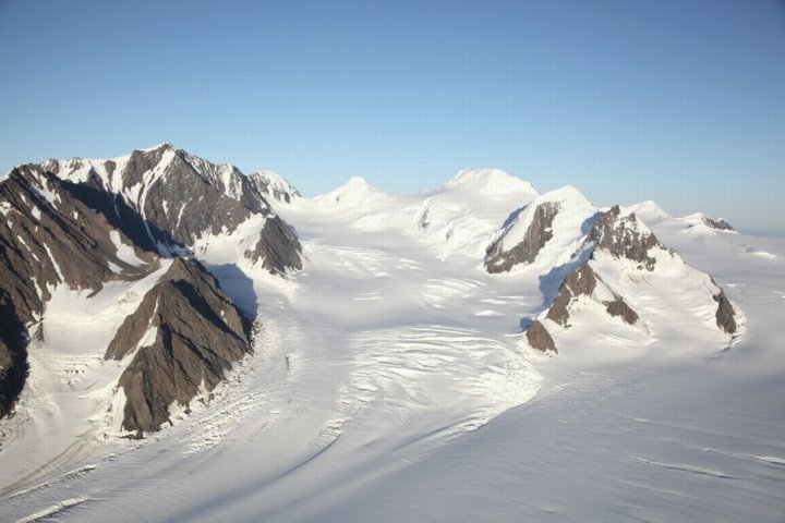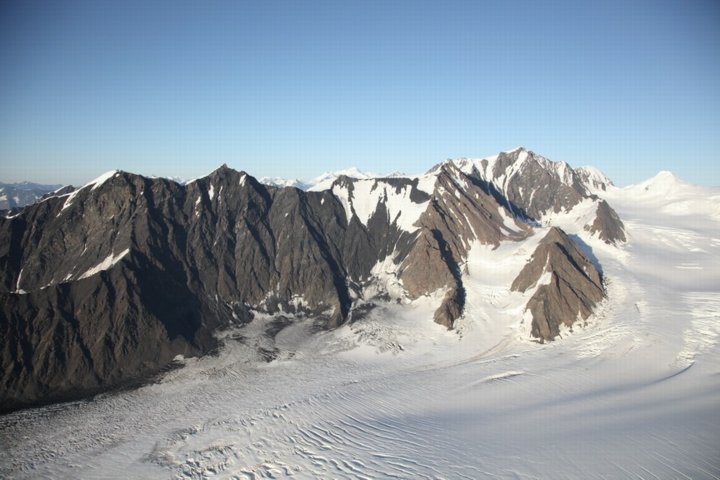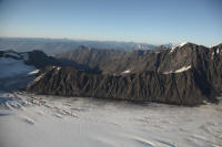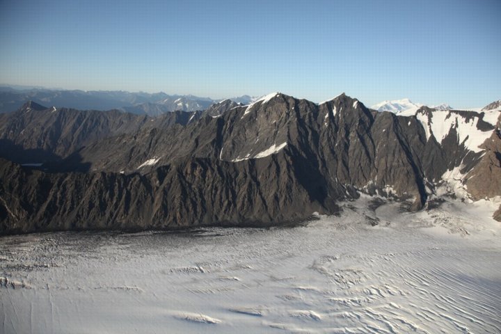 To the right of its route is a mountain range studded with towering, glacier-covered peaks of 10,000 feet or more. On course are smaller mountains in an almost impenetrable