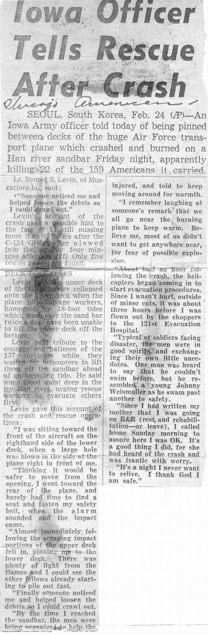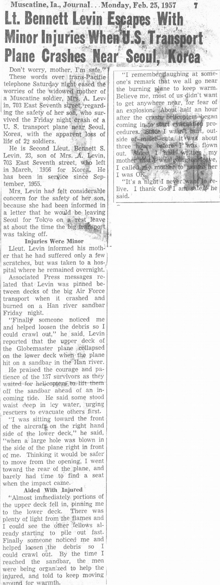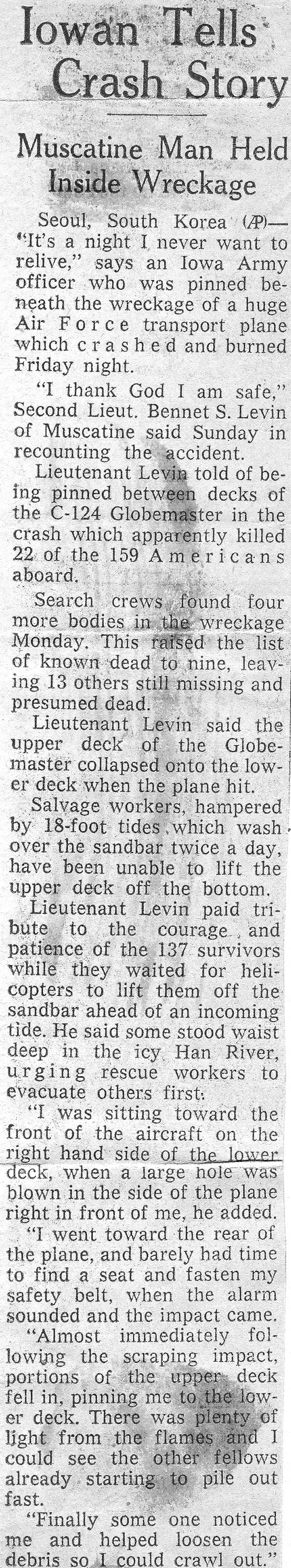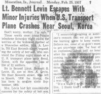 River near Kimpo. It was the second plane crash he survived, having been one of three crewmen who