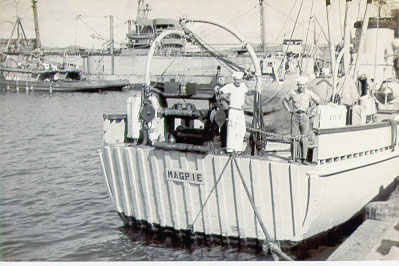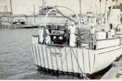 of about thirty minutes, the USS MERGANSER (AMS26) Wherry towed us to the MERGANSER.