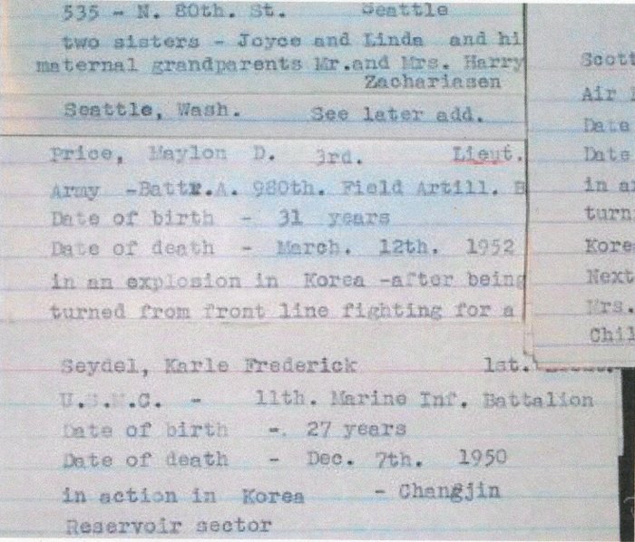 Korean War by Ethyl Fulton, who was key in organizing the Seattle War Memorial. Each card contains the name,