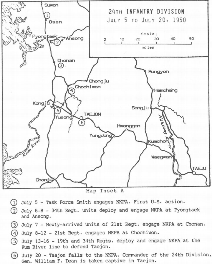 The accounts of the deaths of our 22 Rensselaer County men make up the story of the Korean War. The timing of their deaths is indicative of the severity of the fighting during the five phases of this 3-year-long war. Eleven of the 22 men were casualties in the first 5 months of fighting and 8 occurred during 1951. From September 1951 until July 1953 (21 months), 2 infantrymen and 1 Air Force man from the County became casualties. [Casualty in this case does not include WIAs (Wounded in Action).] Map Inset A The "Police Action"The first US unit to arrive in Korea was the under strength first battalion of the 21st Regiment of the 24th Infantry division. This unit would be known as "Task Force Smith"--named for its commanding officer, Lt. Col. Charles "Brad" Smith. This 440-man force arrived in Taejon on 3 July 1950 and immediately moved north. By 5 July they were dug in on the Seoul-Pusan road north of Osan. The rest of the division was still en route. The 34th Regiment moved by boat from Japan to Pusan and started moving north on 4 July. Their 1st Battalion deployed at Pyongtaek and their 3d Battalion (less L Company) deployed eleven miles east at Ansong. They deployed without artillery support. The rest of the 21st Regiment was still en route. The first to arrive, A and D Companies, moved north from Pusan and deployed two miles south of Chonan. So, the 1st Battalion of the 21st was divided between Osan and Chonan. The 3d Battalion of the 21st was still in Pusan. There was no communication between any of these units! The first encounter with the tanks and infantry of the NKPA occurred at 7:30 a.m. on 5 July 1950 in Task Force Smith's positions. The task force was almost wiped out in a few hours. It was clear by mid-afternoon that the situation was hopeless. The first week of combat saw the NKPA advance fifty air miles from Suwon to the Kum River. They had shattered two ill-trained, ill-equipped, ill-led and thinly disposed American regiments in actions at Osan, Pyongtaek, Chonan, Ansong and Chochiwon and were now preparing to assault the American line of defense at the Kum River. Francis J. Dunn Co. A, 19th Regiment, 24th Infantry DivisionBy 12 July 1950 both the 21st and 34th Regiments of the 24th Infantry Division had sustained severe losses. They withdrew to the south bank of the Kum River and set up a defensive line in an attempt to save Taejon from falling into enemy hands. On the 13th of July the newly arrived 19th Regiment replaced the shattered 21st on the Kum River line. On 14 July the NKPA crossed the Kum and hit the 34th Regiment. This attack left the entire left flank of the 19th Regiment exposed. In the early-morning hours of 16 July the NKPA, supported by artillery, tanks and machine gun fire, crossed the Kum and hit the 1st Battalion, 19th Regiment. The 19th, being outflanked, was forced to withdraw. Their withdrawal was through the road blocks the NKPA had set up in the rear. Survivors were assembled in Yongdong, 30 miles east of Taejon. Of the some-900 men in the 19th Regiment originally on the Kum defensive line when the NKPA attacked on the 16th, only half that number could be found the next day. In memory - Francis J. Dunn - POW 16 Jul 1950.