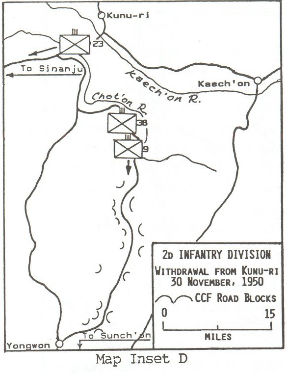 The CCF, promising to retake Seoul by May Day 1951, had failed. Now they turned to the east, moving units into the X Corps sector while two NKPA Corps moved to the south into the Taebaek mountains bordering the east coast where ROK troops were defending the line. The 2d Division would again be in the middle of things. The offensive against X Corps began on 16 May. Three CCF Armies attacked the 1st Marine and 2d Infantry Divisions forcing a withdrawal. By the 19th, the 23/2 was occupying a new line just south of Hangye astride Route 24, the main road running north from Hongch'on to Inje. To the east, the ROK divisions had become disorganized and retreated, leaving the 2d Division's eastern flank exposed to envelopment. The rapid reassignment of the 3d Infantry Division from their positions in I Corps succeeded in stabilizing the eastern front and the assignment of the 187th Airborne Regiment to X Corps helped strengthen the 2d Division's line.
