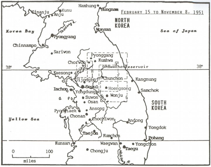 In the west our troops were occupying the southern base of the Iron Triangle in the Chorwon/Kumhwa area. In the east the ROKs, the US 2d Division and the 1st Marine Division occupied the high mountains northeast of the Hwachon Reservoir.