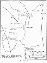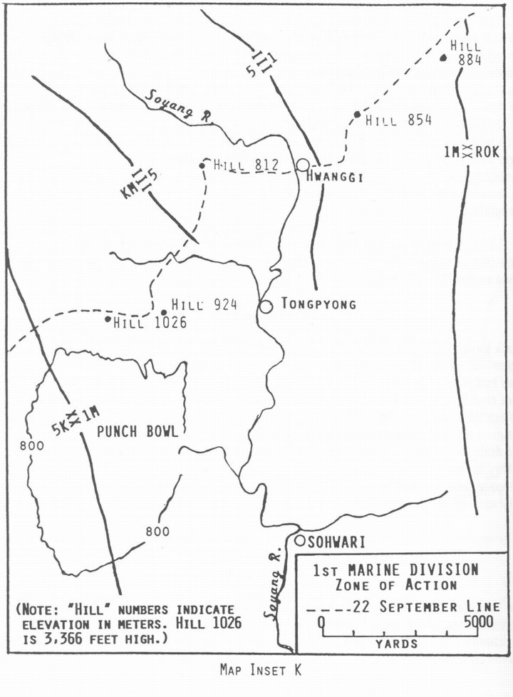 Twenty miles northeast of the Hwachon Reservoir lay a circular valley--an ancient volcanic crater four to five miles in diameter and surrounded by terrain ranging from one to three thousand feet in elevation. On 31 August the 1st Marine Division began an attack to take several hills on the northeast rim of this crater called the Punchbowl. By 3 September the entire northern lip of the bowl was taken and by 20 September the Marines had advanced to secure most of the dominating hill masses northeast of the Punchbowl. The division's front now extended some 13 miles and despite desperate NKPA attempts to dislodge the Marines from these hills, they remained in place and the advantage of terrain remained in our hands.