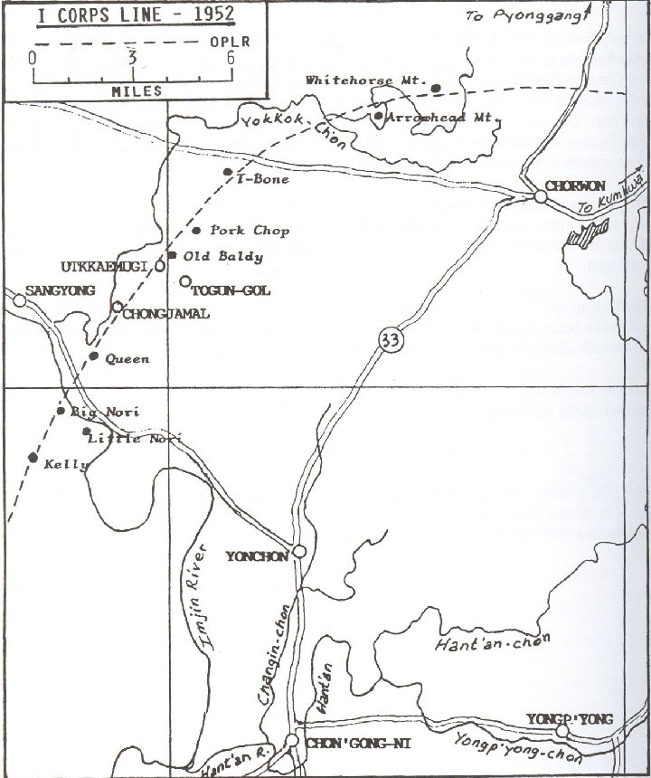 The defensive line that the 45th Division inherited from the 1st Cavalry Division ran from Hill 281 (Arrowhead), about 5 miles west-northwest of Chorwon to the village of Togun-gol, about 11 miles southwest of Chorwon. Except for Hill 281, all of the division's front lines lay south of Yokkok-ch'on. Included in the 179th Regiment's sector was Hill 266--Old Baldy--so named because it had been denuded of growth due to the amount of artillery fired on it in previous battles for its possession. Its position and height made it the dominating hill in that sector. It was, at that time, in Chinese hands.