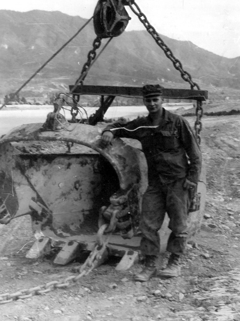 This unit was attached to the 19th Combat Engineer Group, came to Korea on October 7, 1950, worked its way north to Hungnam area, was evacuated from there to Pusan, and began to work its way north again, building roads and airfields. Our largest project was to build the K-52 airfield near Yanggu, North Korea, beginning September 26, 1951. This was unfortunate because it left the winter time with its frozen ground in which to make the large cuts and fills. The following seven months were spent with the entire company on the Yanggu airfield. This was a 6500 foot airfield, 250 feet wide. It had two warm-up aprons, 450x300 feet, a taxi-way 120 feet wide, 5000 feet long, and two adjacent parking aprons, one 300 feet by 850 feet and the other 500 feet by 700 feet. It was designed for 40,000 pound wheel-loads, but actually was built much stronger as a safety measure due to the fact that most sub-grade and base courses were of necessity placed and stabilized during the winter time. Unfortunately, the most satisfactory location available was one that spanned rice paddies and hills. Consequently, it was necessary to make cuts as deep as 30 feet for thousands of feet and hundreds of feet wide and to follow these with fills as deep as 16 feet for thousands of more feet. The completed job required the movement of two and a half million yards, the construction of 3,374 feet of culvert with a cross section area as large as 64 square feet, the destruction of a rock hill containing about 100,000 cubic yards, and the crushing of about 40,000 cubic yards of rock. Most of this work was done under the worst weather conditions. The field was completed July 28, 1952, except for the spreading of about 10,000 cubic yards of the crushed rock surfacing material. This was the largest airfield completed in North Korea at that time. In July 1954, this airfield was turned over to the Republic of Korea army. The 630th Engineers built 22 airfields, ranging in length of 1200 feet to 6500 feet, K-52. The 1200 foot was built overnight at Chungju, January 3, 1951 for the use of 10th Corps liaison planes, the Stinson L-17 sometimes called the "Grasshopper."